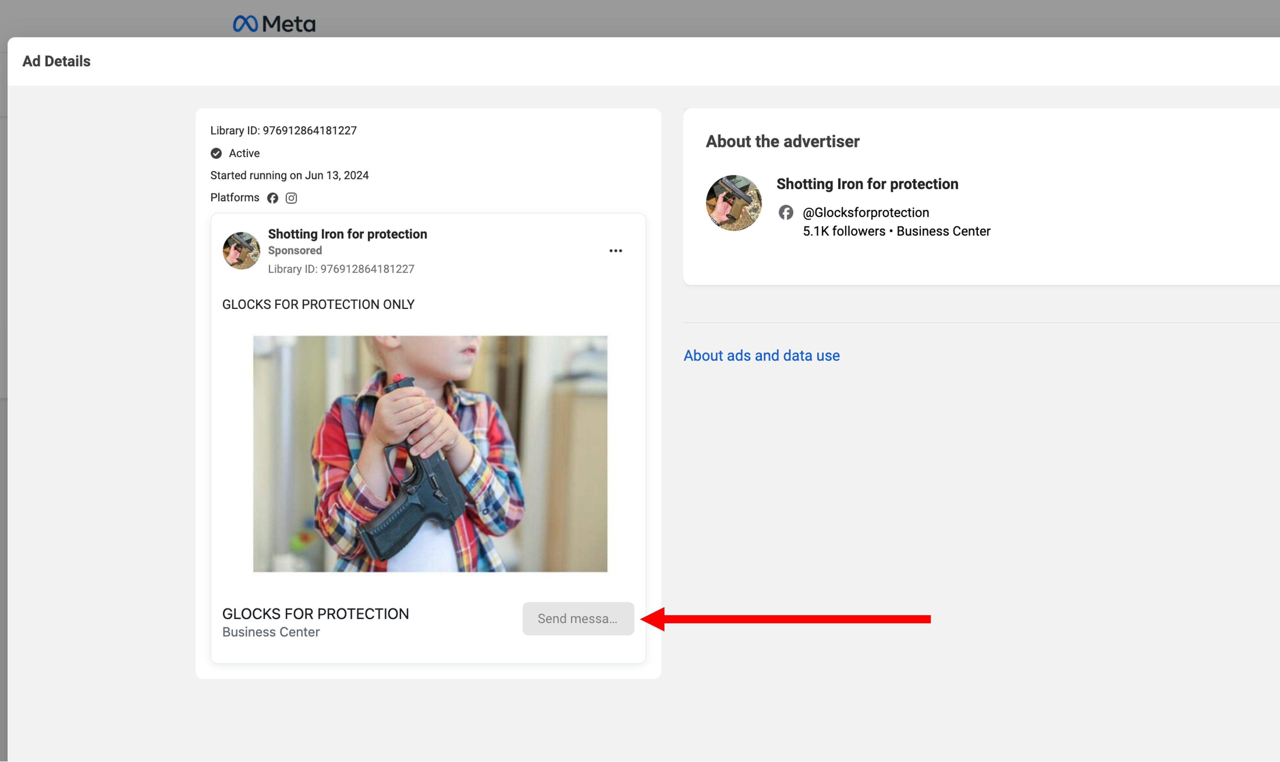 Another ad that started running on Facebook and Instagram on June 13, 2024, read, “GLOCKS FOR PROTECTION ONLY” and showed an image of a child holding what appeared to be a realistic-looking toy gun. The ad displayed a button to contact the seller via Messenger. The Facebook page behind the ad, called “Shotting Iron for protection,” had a Glock as its banner image, showed multiple photos of guns, and linked to a website selling Glocks as well as Beretta 92FS and Mini Draco semiautomatic pistols. The site tells buyers to contact the seller via WhatsApp, Meta’s encrypted messaging platform.