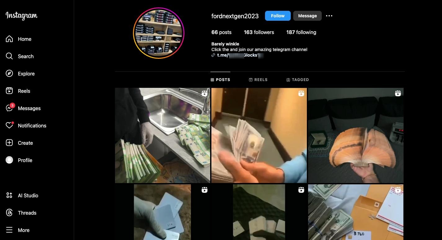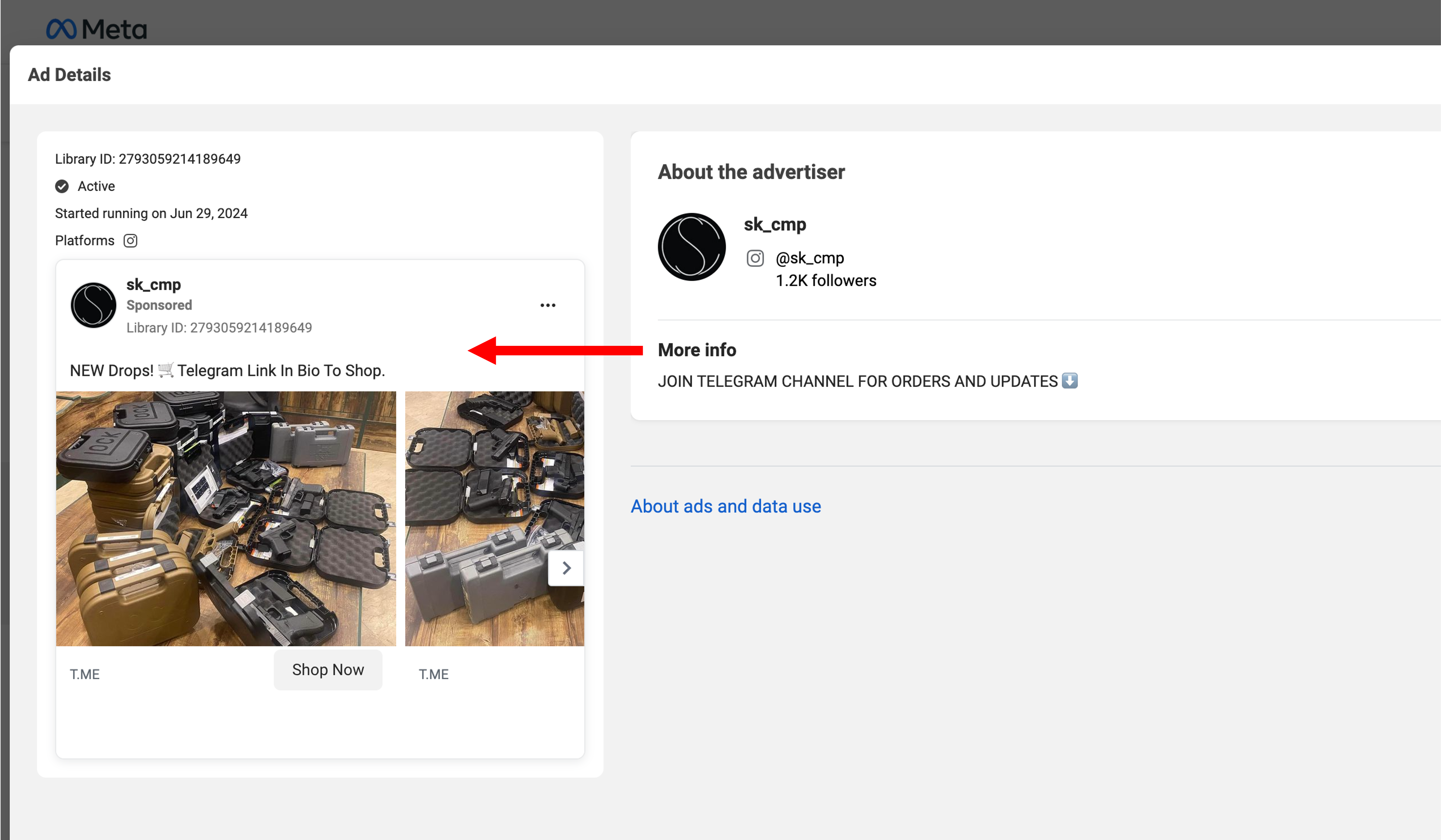 Three Instagram profiles ran ads in June 2024 showing an identical photo of Glock pistols and cases and linking to the same Telegram channel.