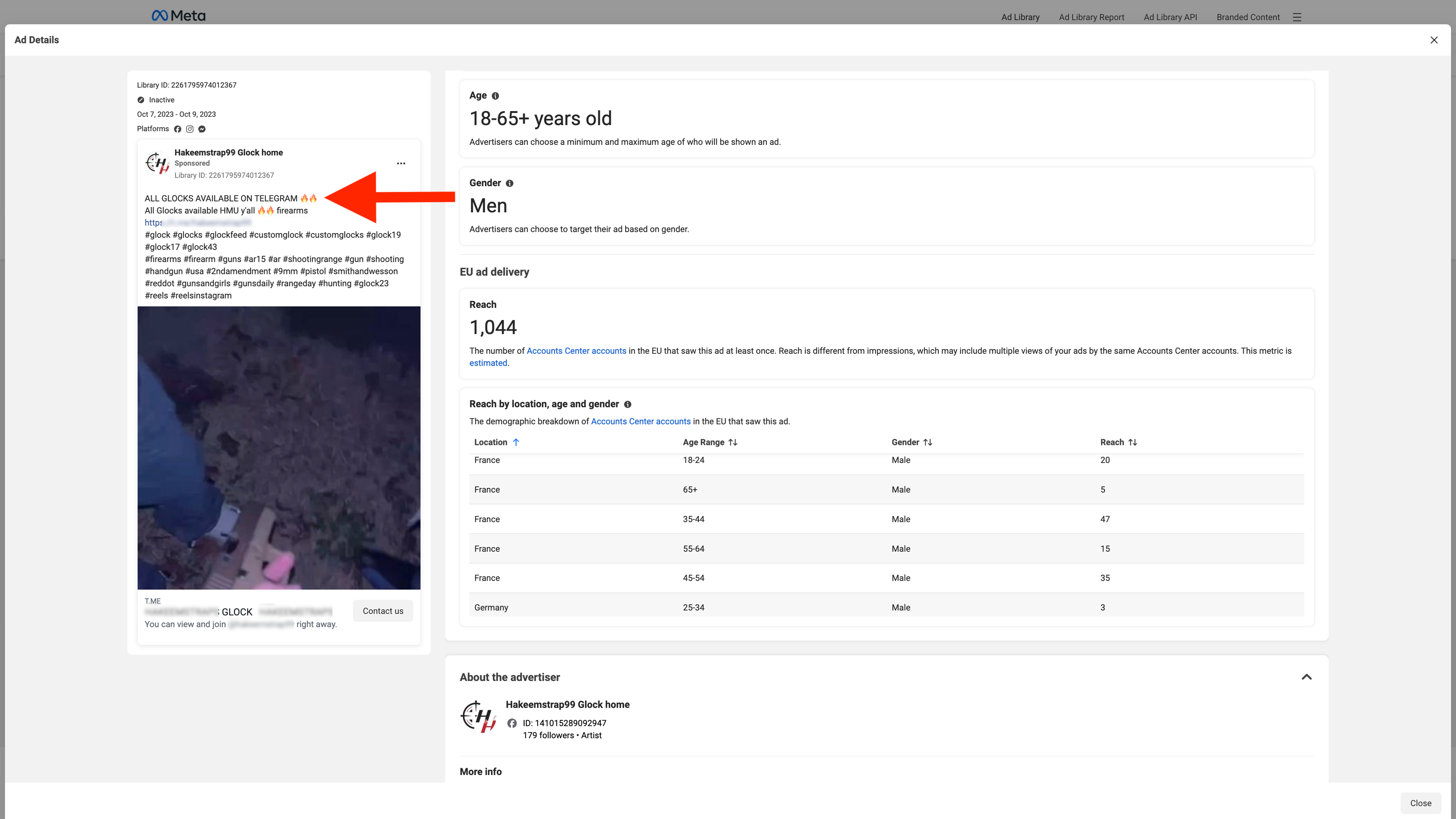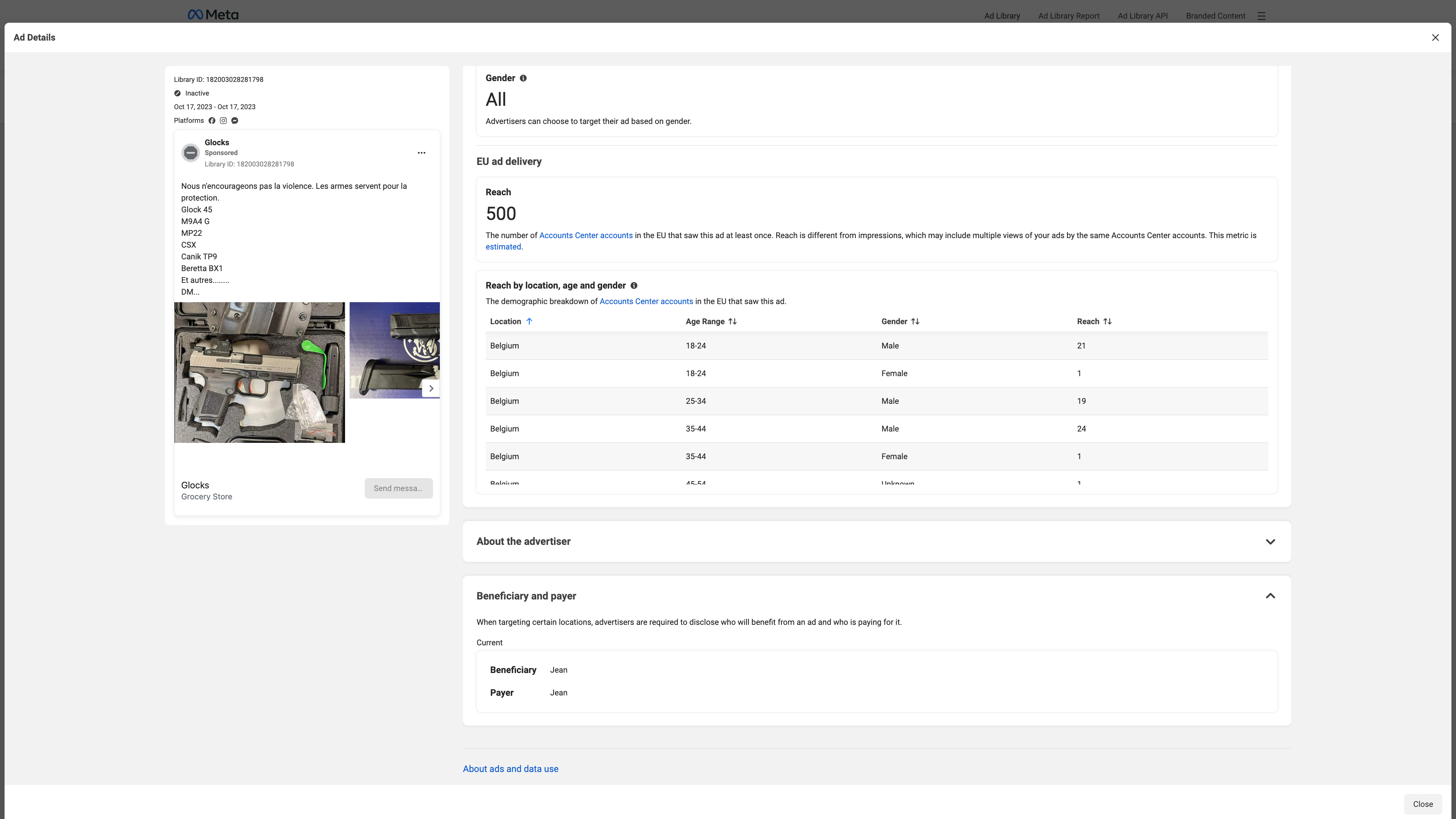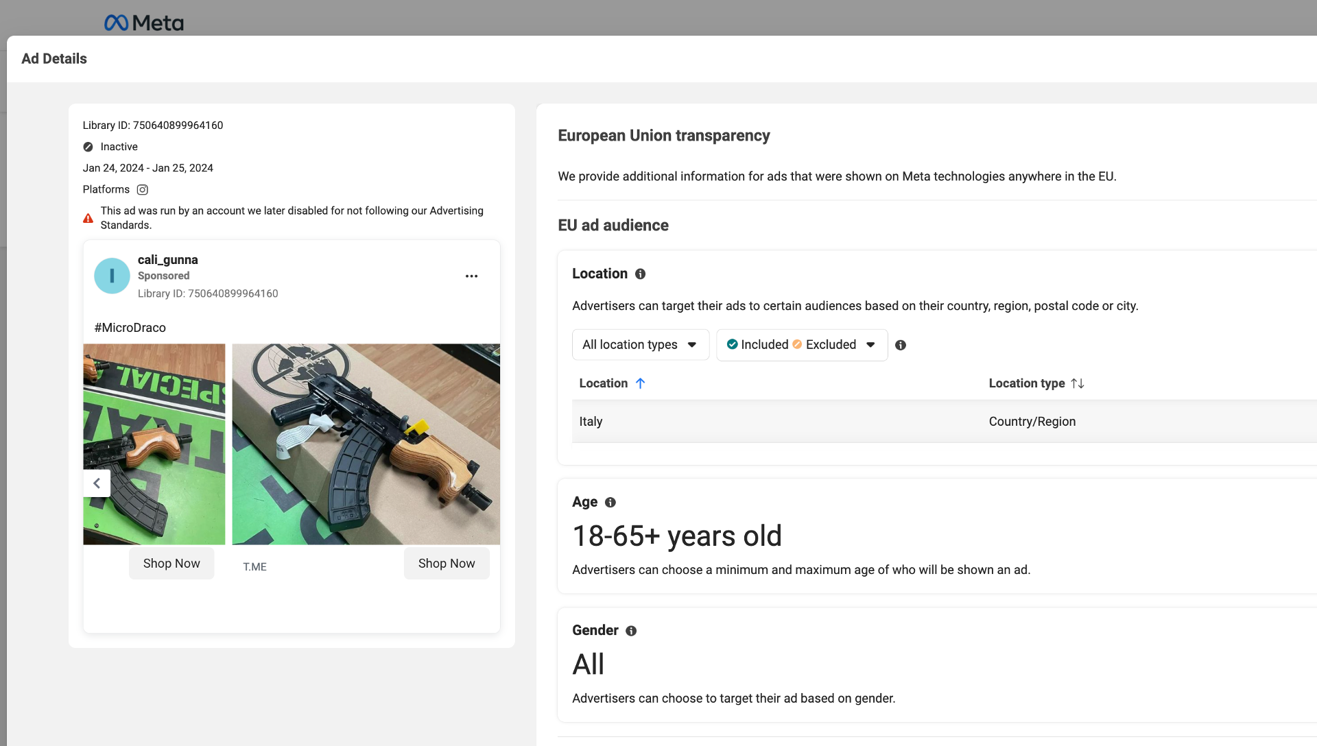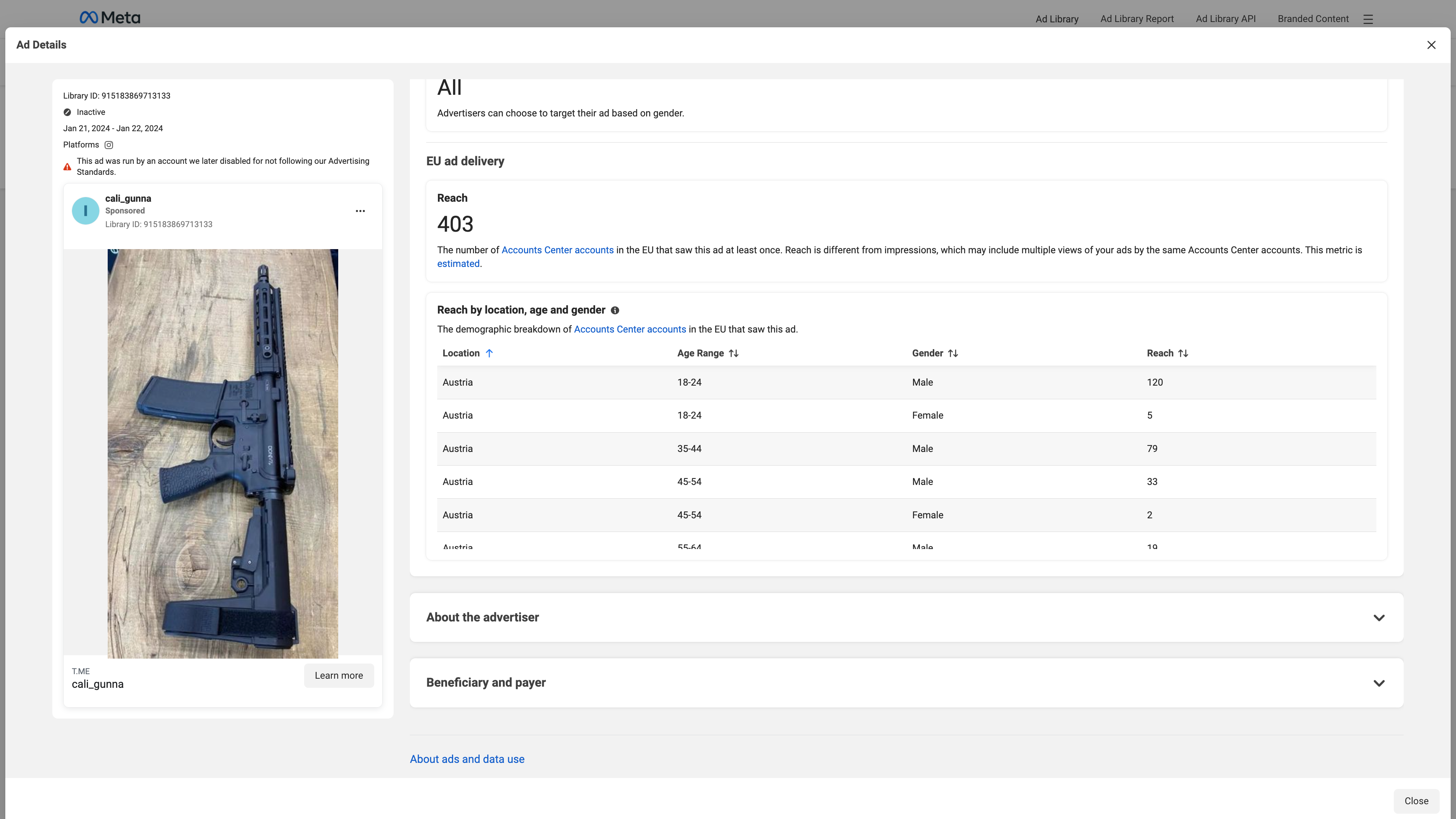 Because this ad ran in the European Union, Meta provided data about the ad’s reach in EU countries in accordance with the transparency requirements of the Digital Services Act. The Meta Ad Library shows the ad reached 1,044 men aged 18 or older in France, Germany, Ireland, and Italy, giving a window into how Meta platforms help gun sellers target potential customers. (Meta does not provide reach data for ads outside the EU and in fact deletes records of non-EU ads once they are no longer active, with the exception of ads about politics, elections, and social issues.)