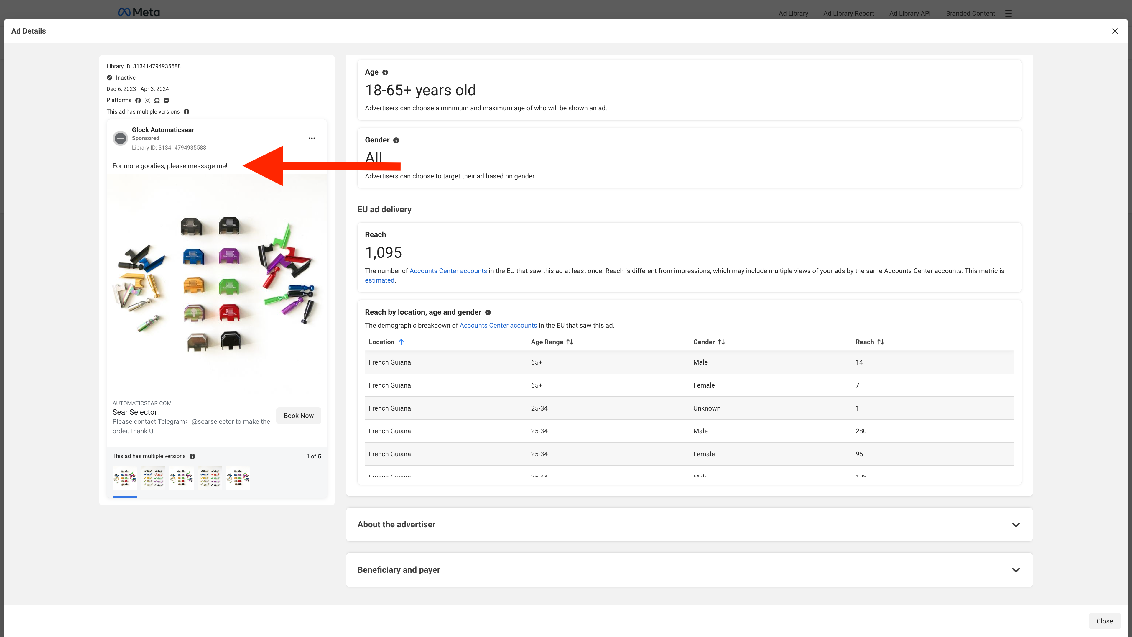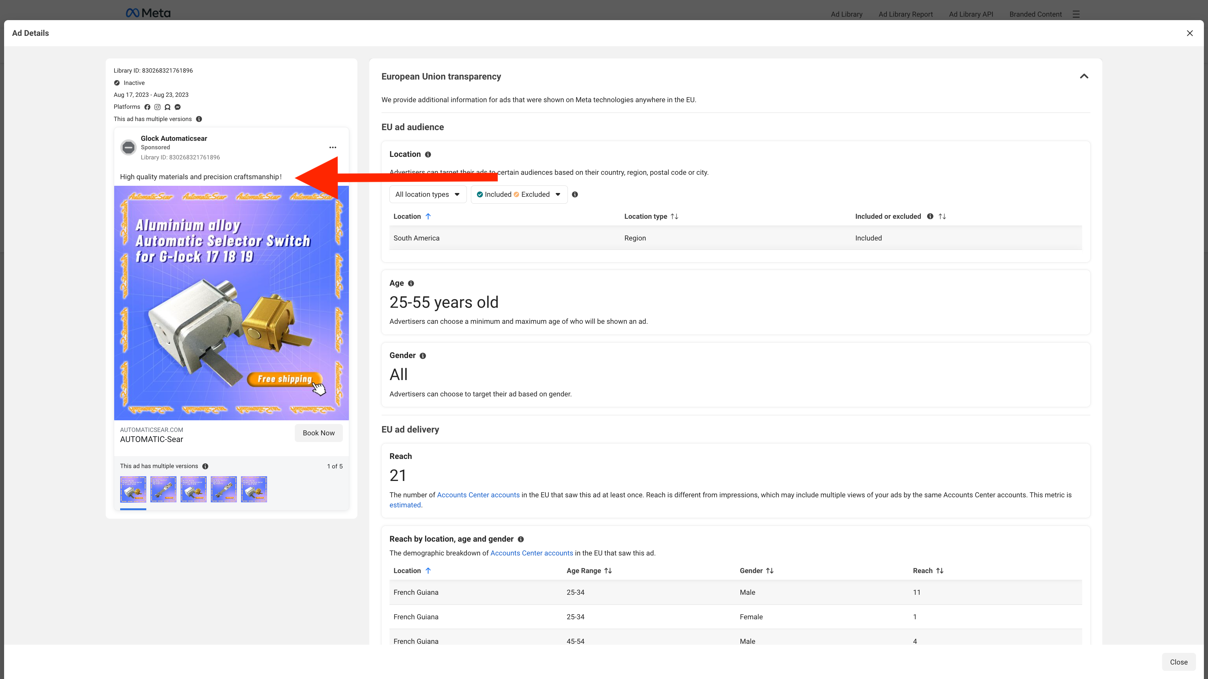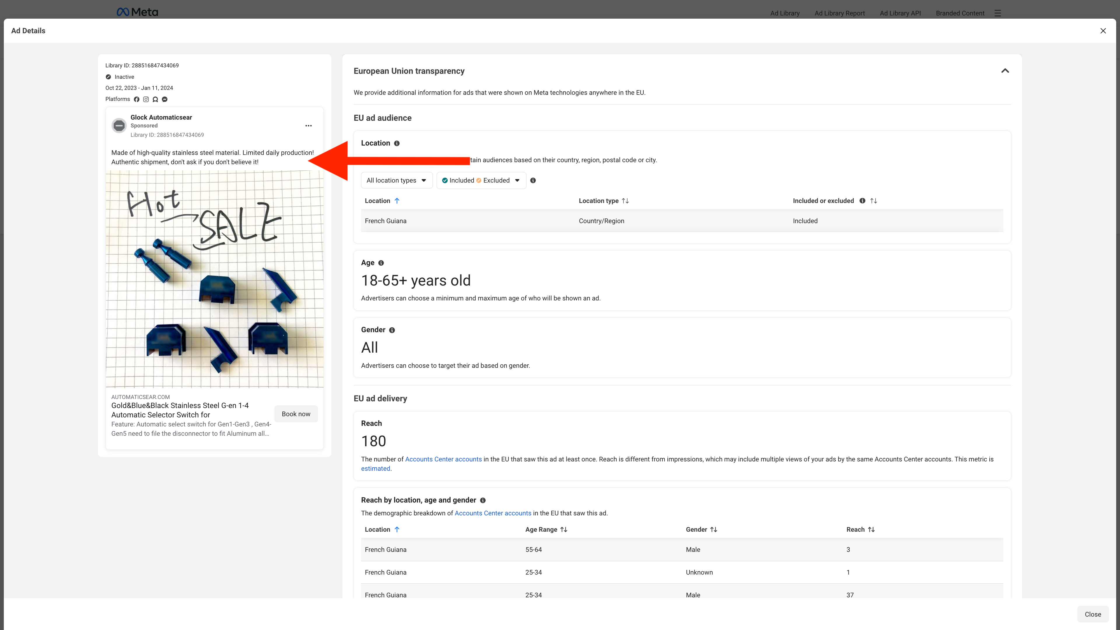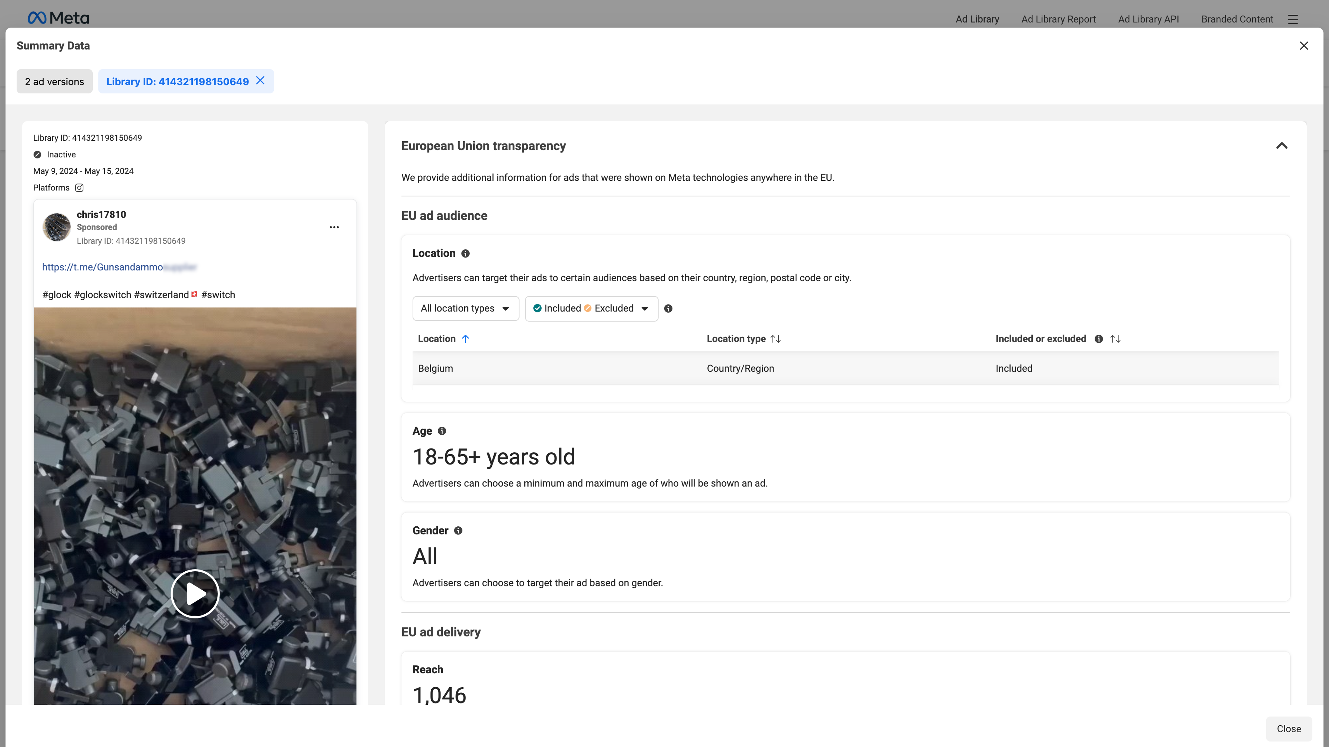 Because this ad ran in the European Union, Meta provided data about the ad’s reach in EU countries in accordance with the transparency requirements of the Digital Services Act. The Meta Ad Library shows the ad reached 1,044 men aged 18 or older in France, Germany, Ireland, and Italy, giving a window into how Meta platforms help gun sellers target potential customers. (Meta does not provide reach data for ads outside the EU and in fact deletes records of non-EU ads once they are no longer active, with the exception of ads about politics, elections, and social issues.)