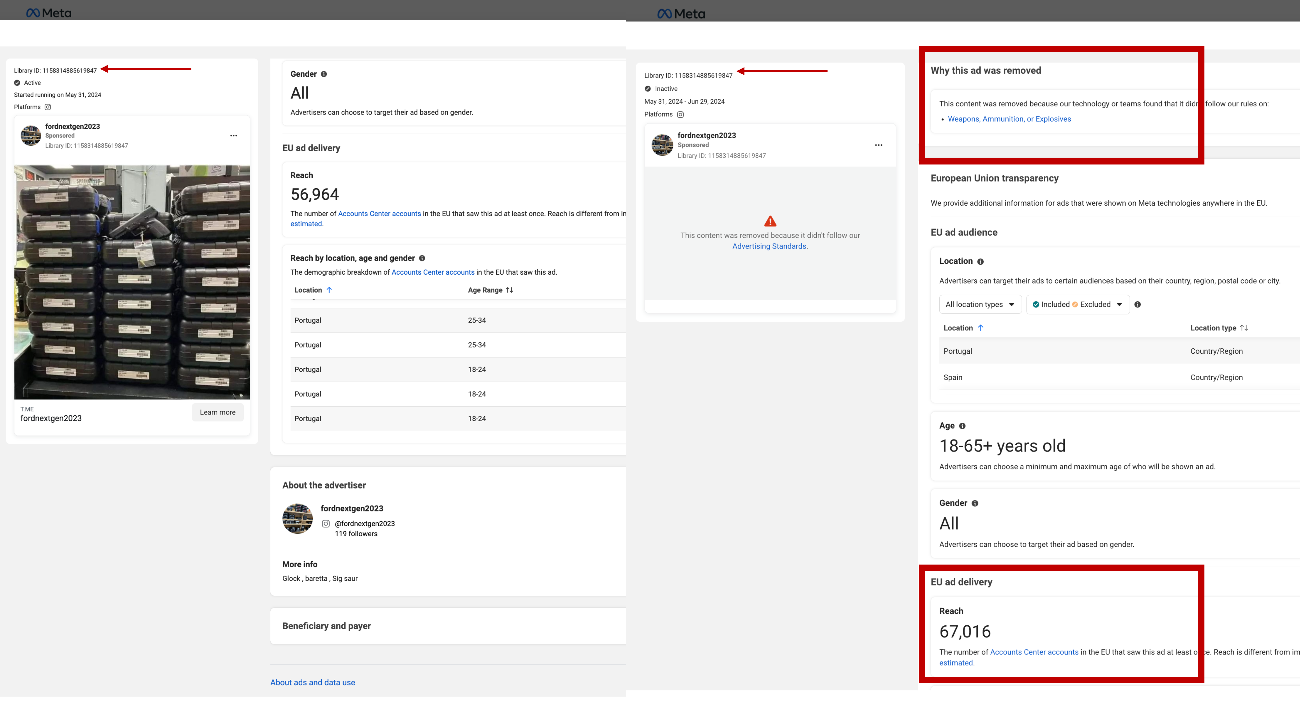The Instagram profile behind this ad has advertised weapons on multiple occasions. Another of its ads that ran from May 31 to June 29, 2024, showed a handgun propped up against a pile of black cases and linked to the same Telegram account mentioned above. The ad reached 67,000 users in Portugal and Spain before it was removed by Meta’s systems for violating advertising standards. However, Meta did not disable the Instagram profile itself, which remained active offering guns for sale. (The Washington Post reported in 2022 that Facebook gives gun sellers 10 strikes before kicking them off the platform, which Meta did not dispute.)