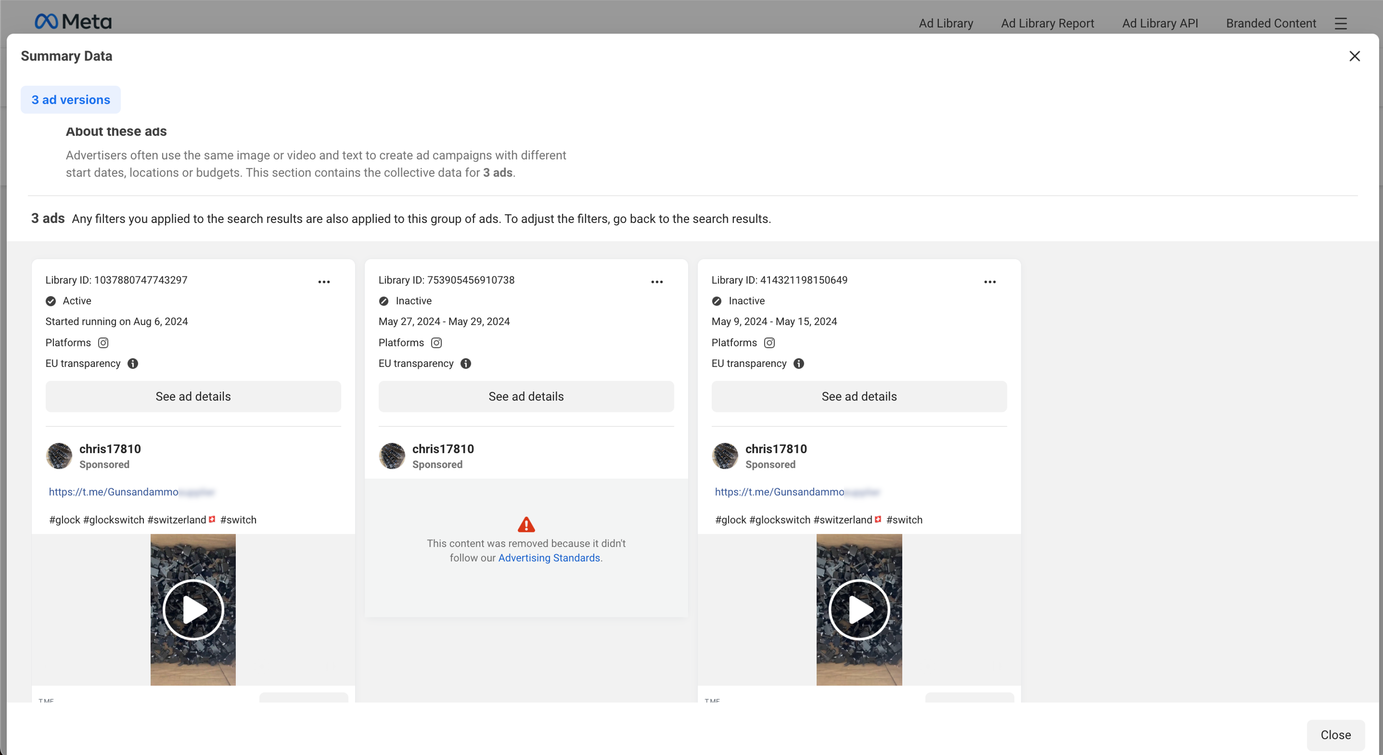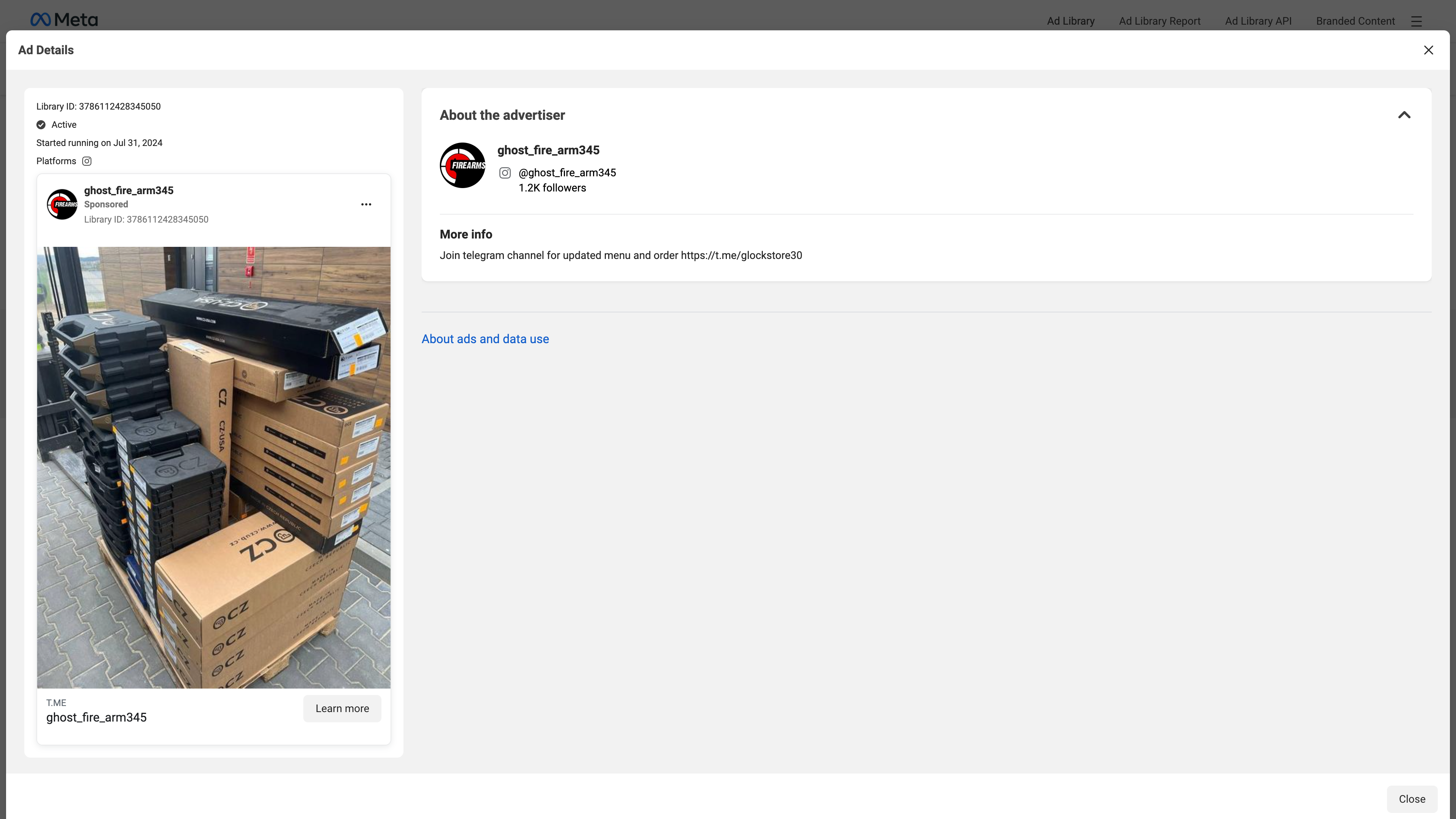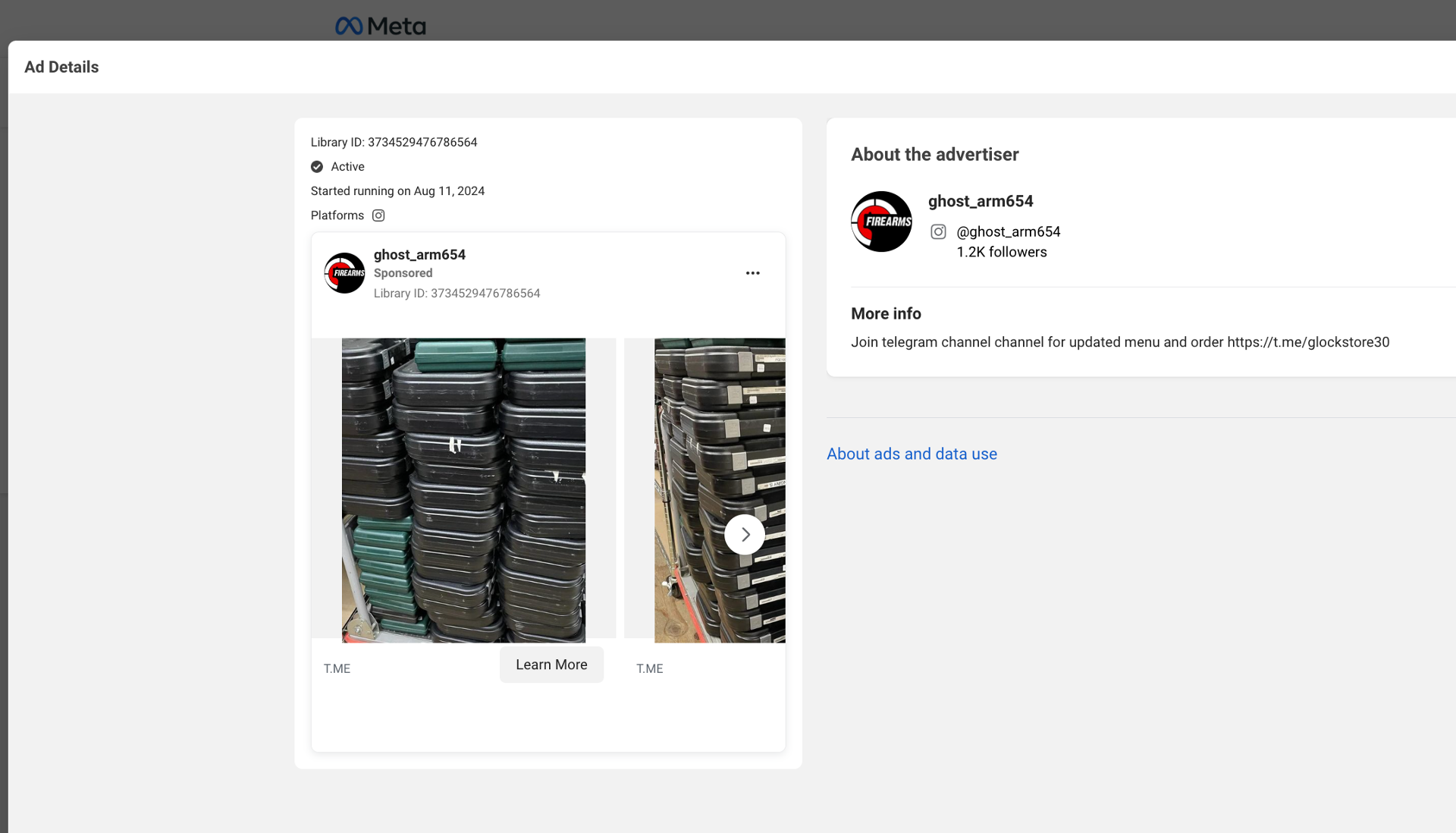 One ad that ran on Facebook, Instagram, and Messenger in October 2023 pointed to a Telegram channel for Glocks.