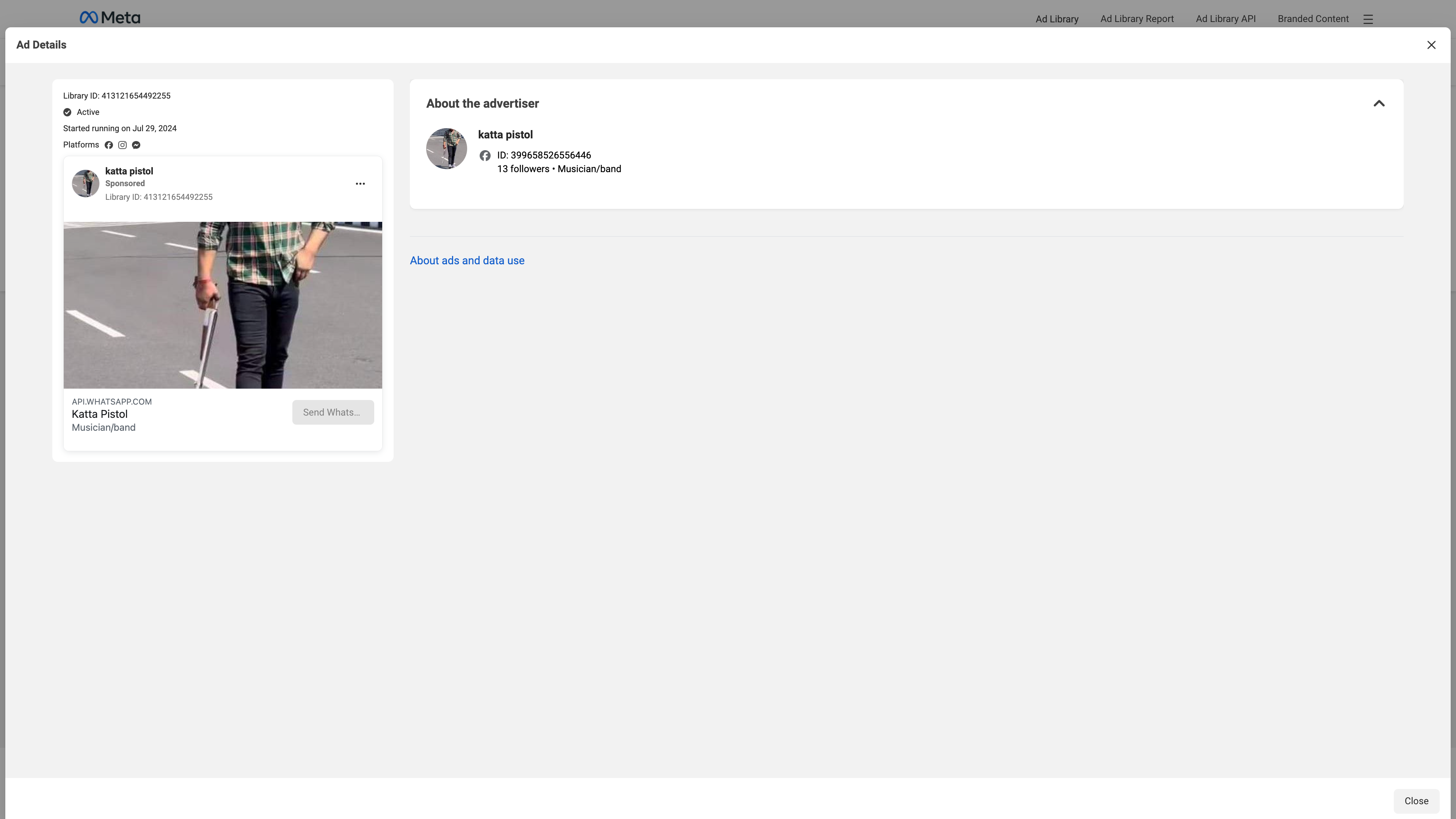 Meanwhile, an ad from “katta pistol” that started running on Facebook, Instagram, and Messenger on July 29, 2024, showing someone carrying a rifle, had a button to message the seller via their WhatsApp business account. The manager of the Facebook page behind the ads gave their location as India.