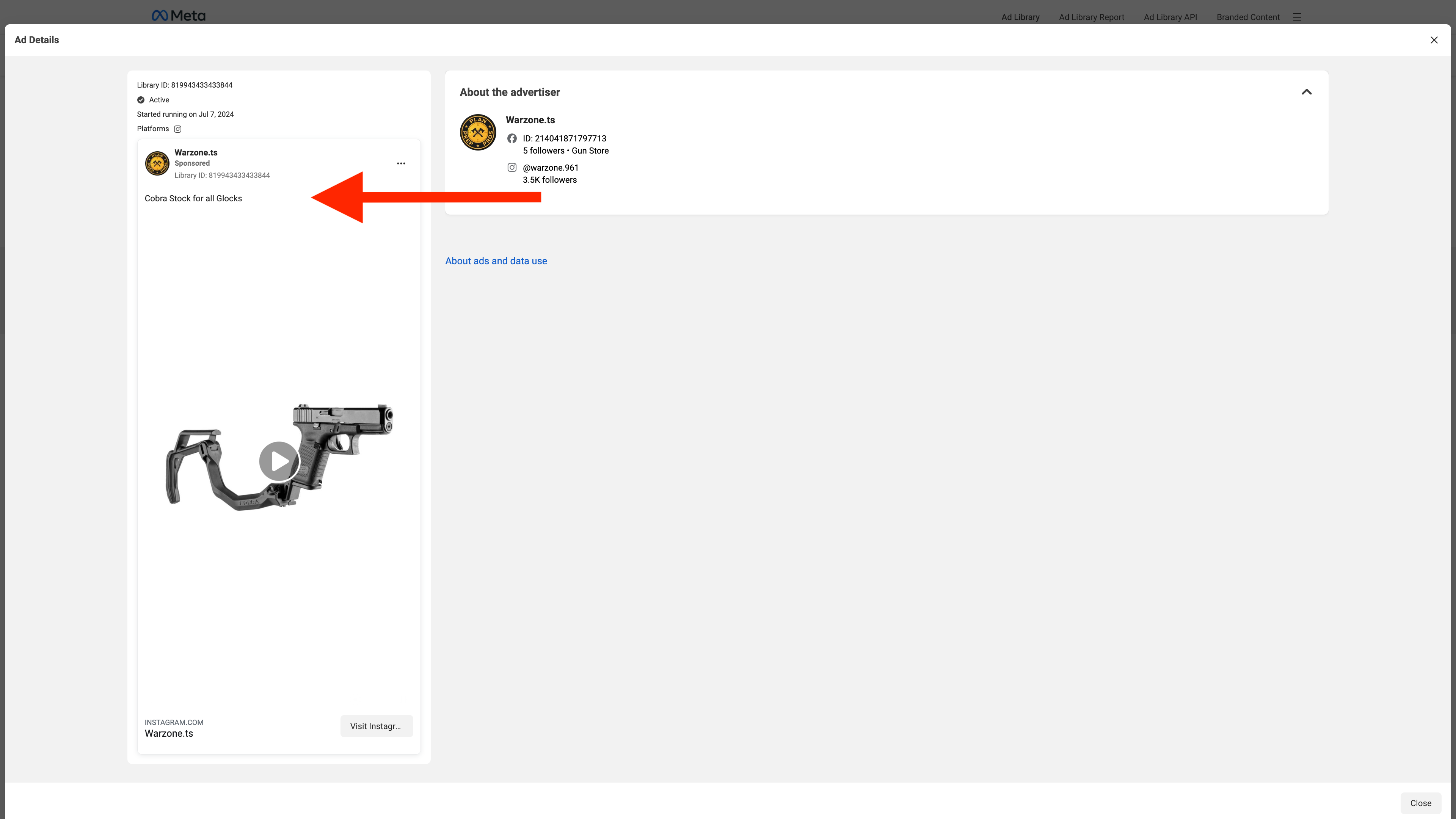 Two Instagram ads from July 2024 showed a Glock pistol equipped with a collapsible stock.