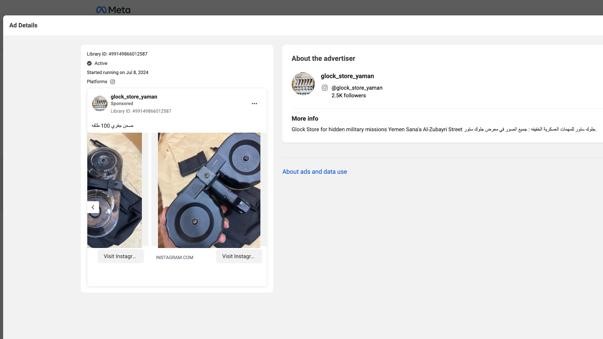 Another Instagram ad that started running July 8, 2024, offered, in Arabic, a “100-round magazine” and showed images of drum magazines. The ad linked to an Instagram profile called “glock_store_yaman,” which calls itself a “Glock Store for hidden military missions” and gives an address in Sanaa, the capital of Yemen. The profile was full of photos and short-form Reels videos of handguns and rifles. Many of the posts directed users to the store’s address in Sanaa. (Yemen has experienced years of civil war that has left more than 150,000 people dead.)