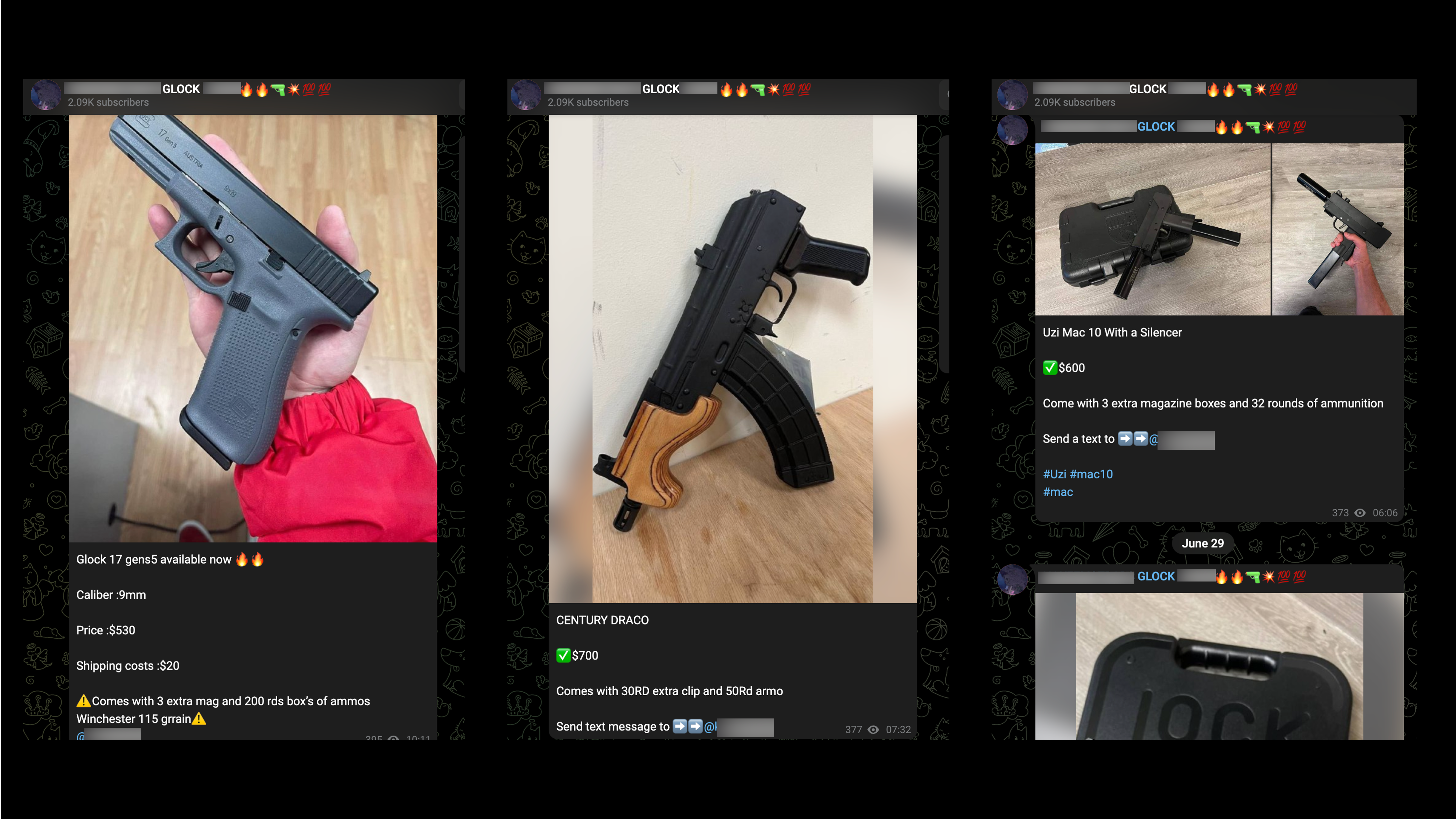 The investigation also identified a series of Instagram ads in June 2024 that featured an identical photo of Glock pistols and cases. The ads, run by three different accounts, directed users to the same Telegram channel. The channel offered a multitude of weapons for sale, including a Glock 43, Mini Draco, and MP5 submachine gun, giving descriptions and prices for each. The Telegram account prompted visitors to make orders via direct message.