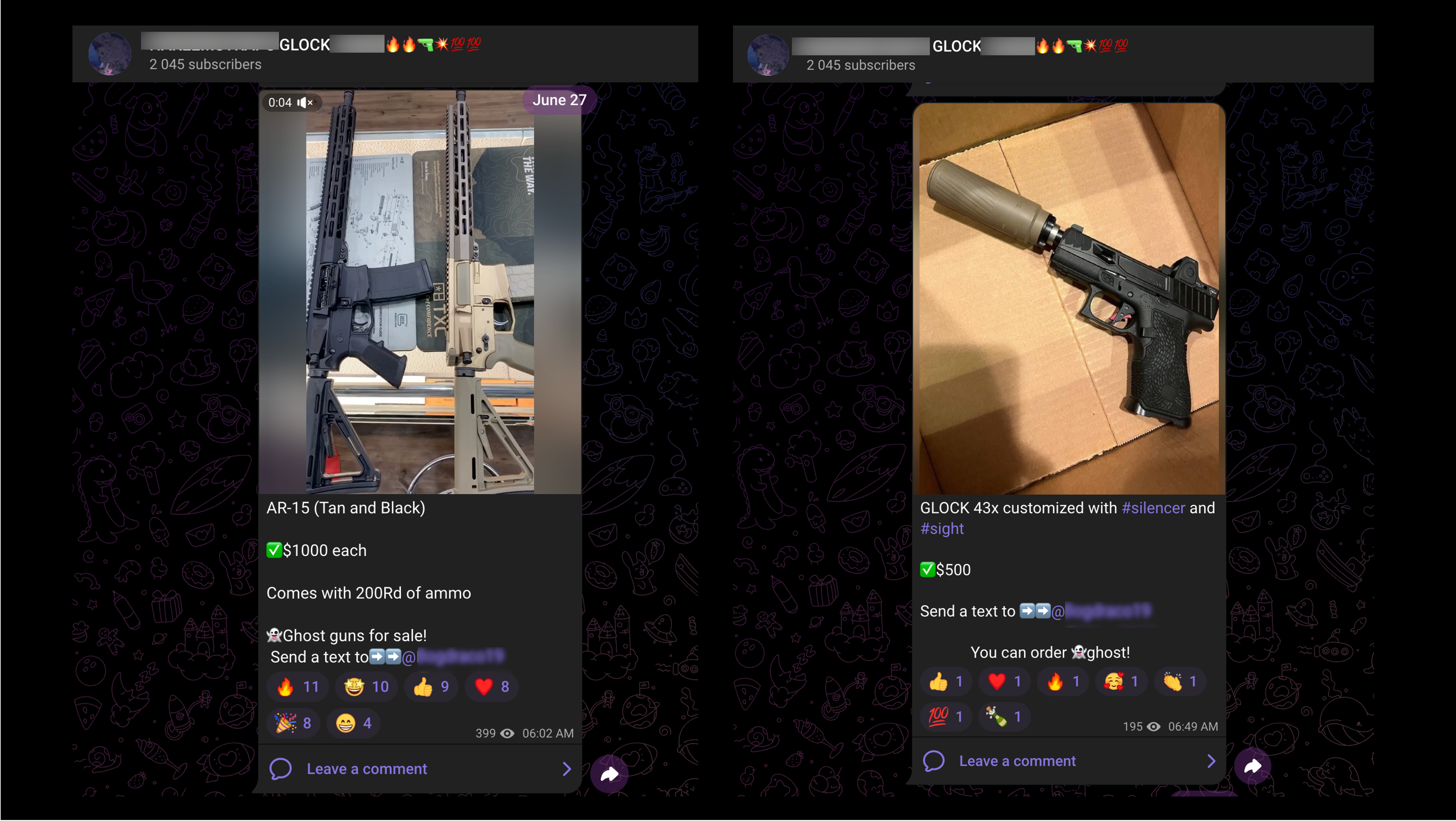 One ad that ran in early October 2023 on Facebook, Instagram, and Messenger, read, “ALL GLOCKS AVAILABLE ON TELEGRAM 🔥🔥” and linked to a Telegram channel that promised “Discreet shipping.” The Telegram account offered a variety of Glocks and other firearms for sale including AR-15 rifles and submachine guns, giving prices for each.