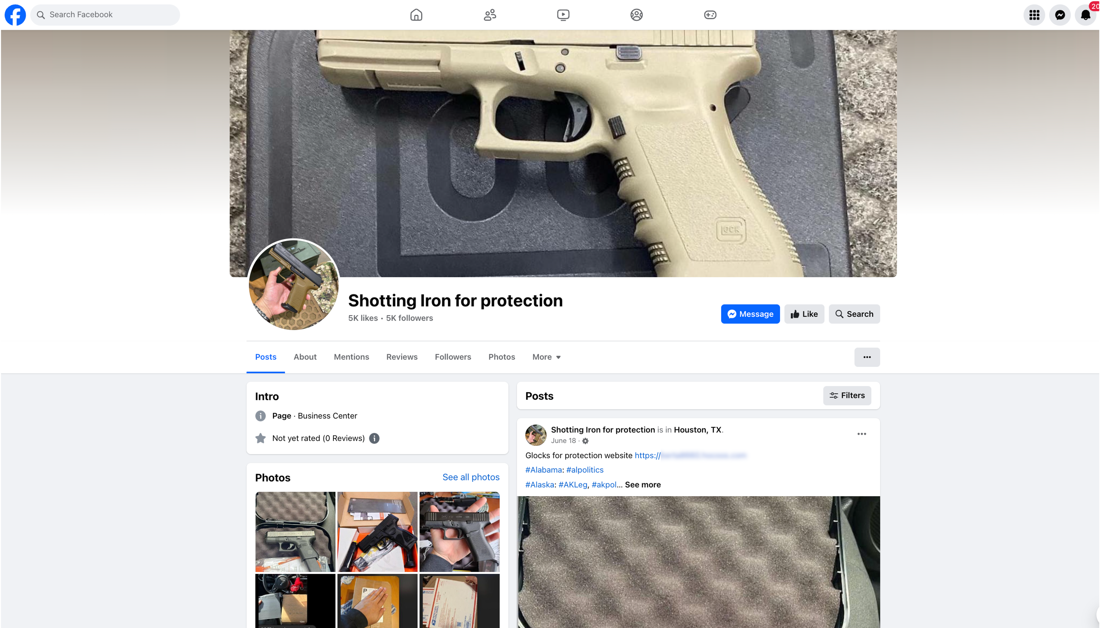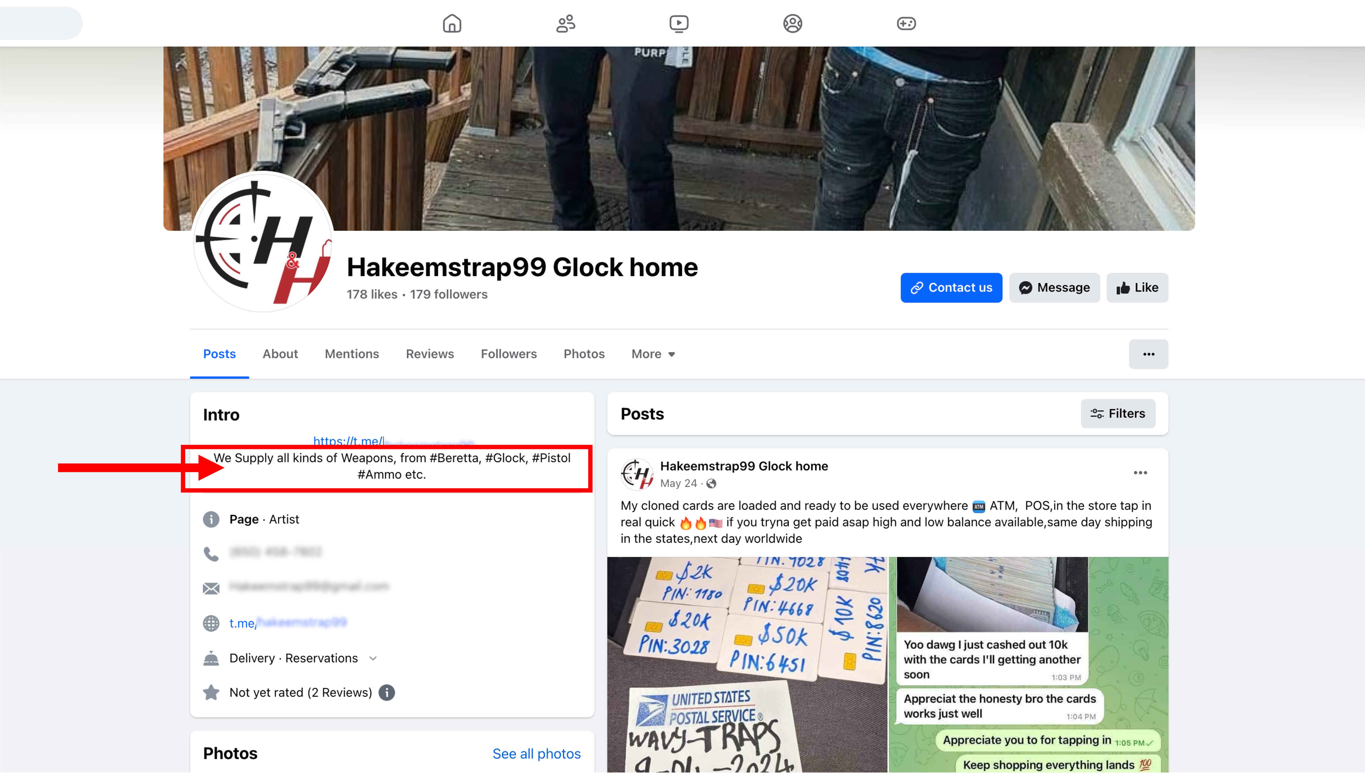 The ad included a variety of hashtags including #usa, #2namendment, #gunsandgirls, and #reels, that appeared to be aimed at boosting the ad’s reach on Instagram. The Facebook page behind the ad, “Hakeemstrap99 Glock home,” made no secret of its business, stating, “We Supply all kinds of Weapons, from #Beretta, #Glock, #Pistol #Ammo etc.” The page, which described itself as a Delivery and Reservations service, linked to the same Telegram account described above.
