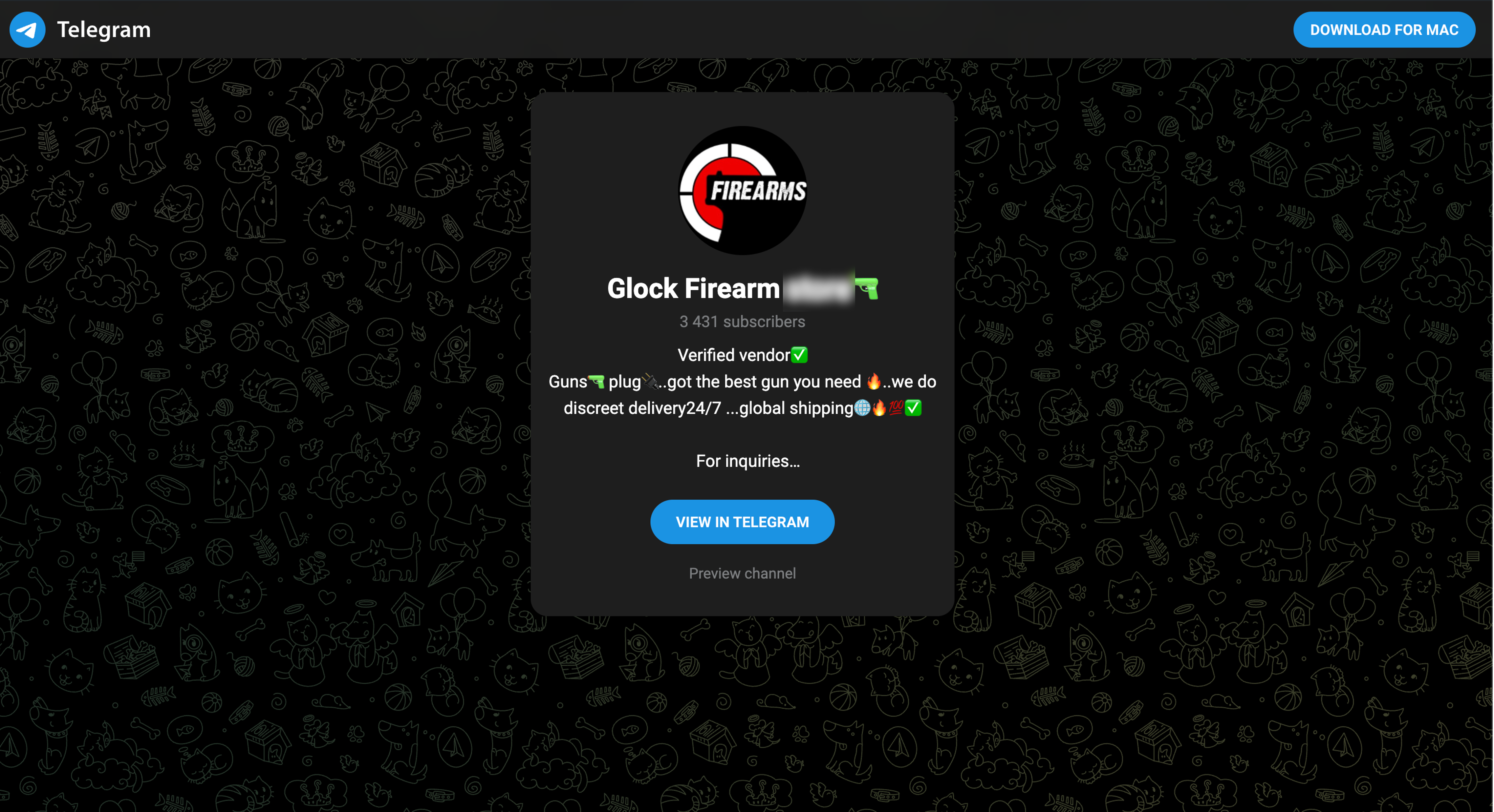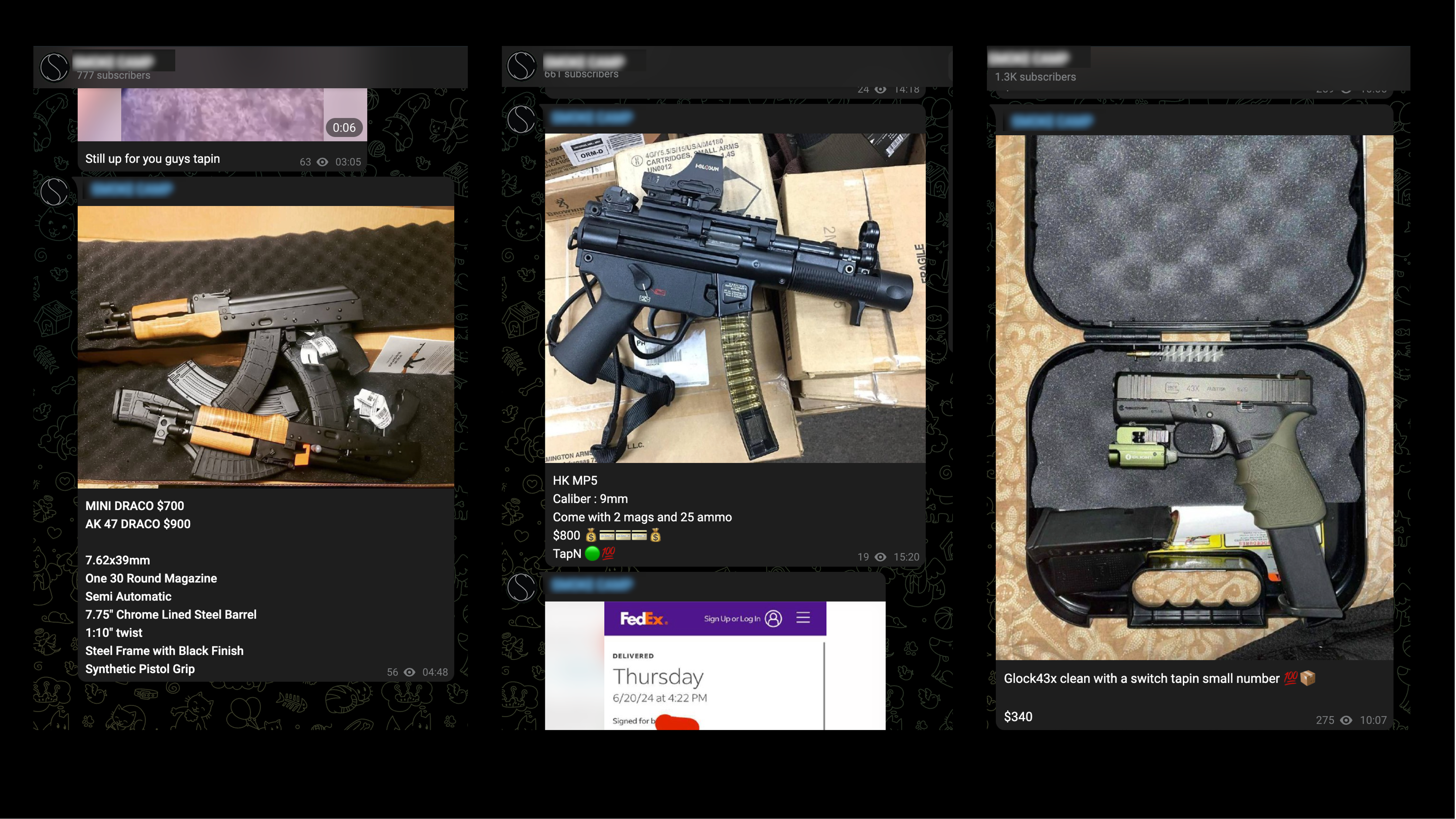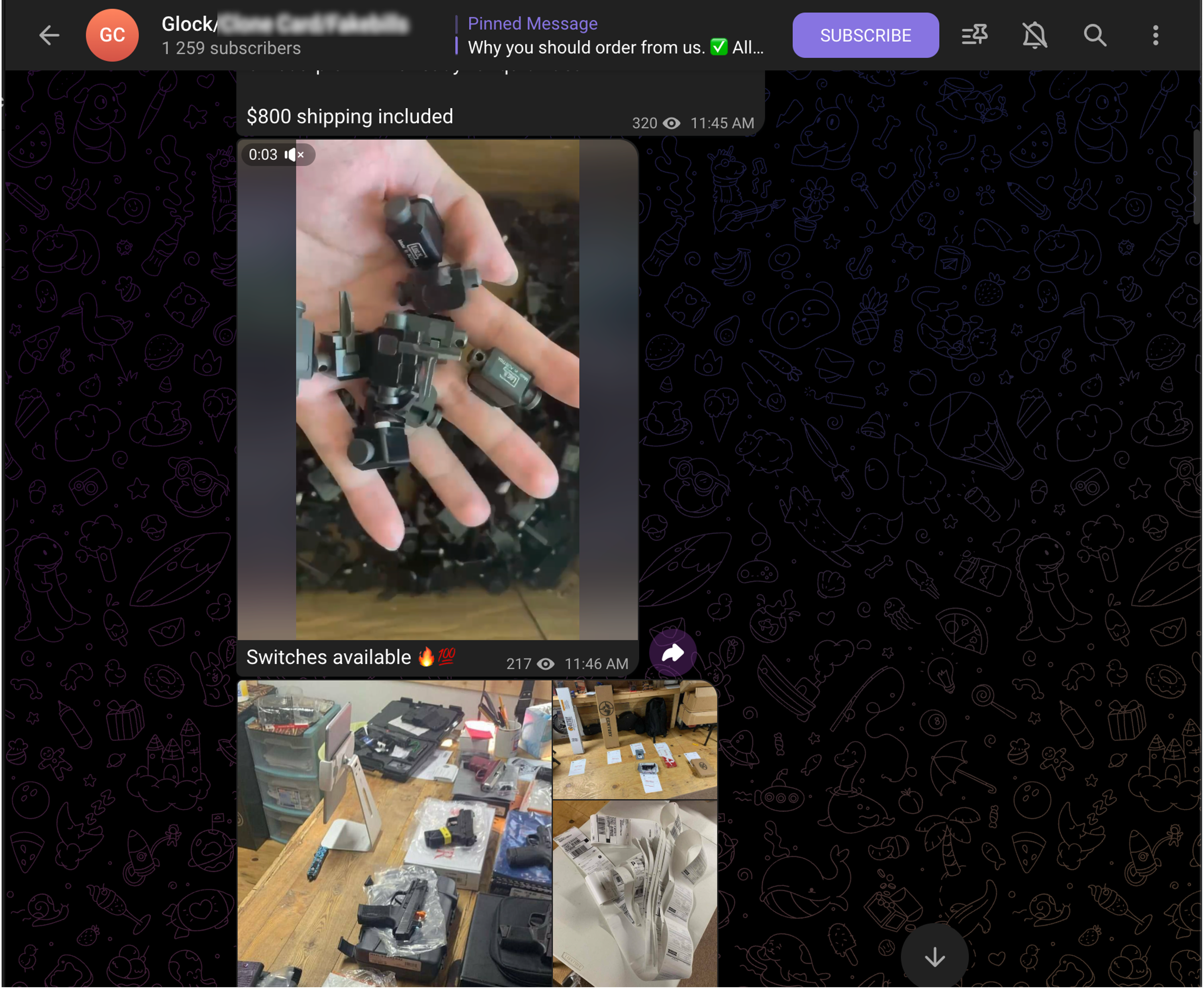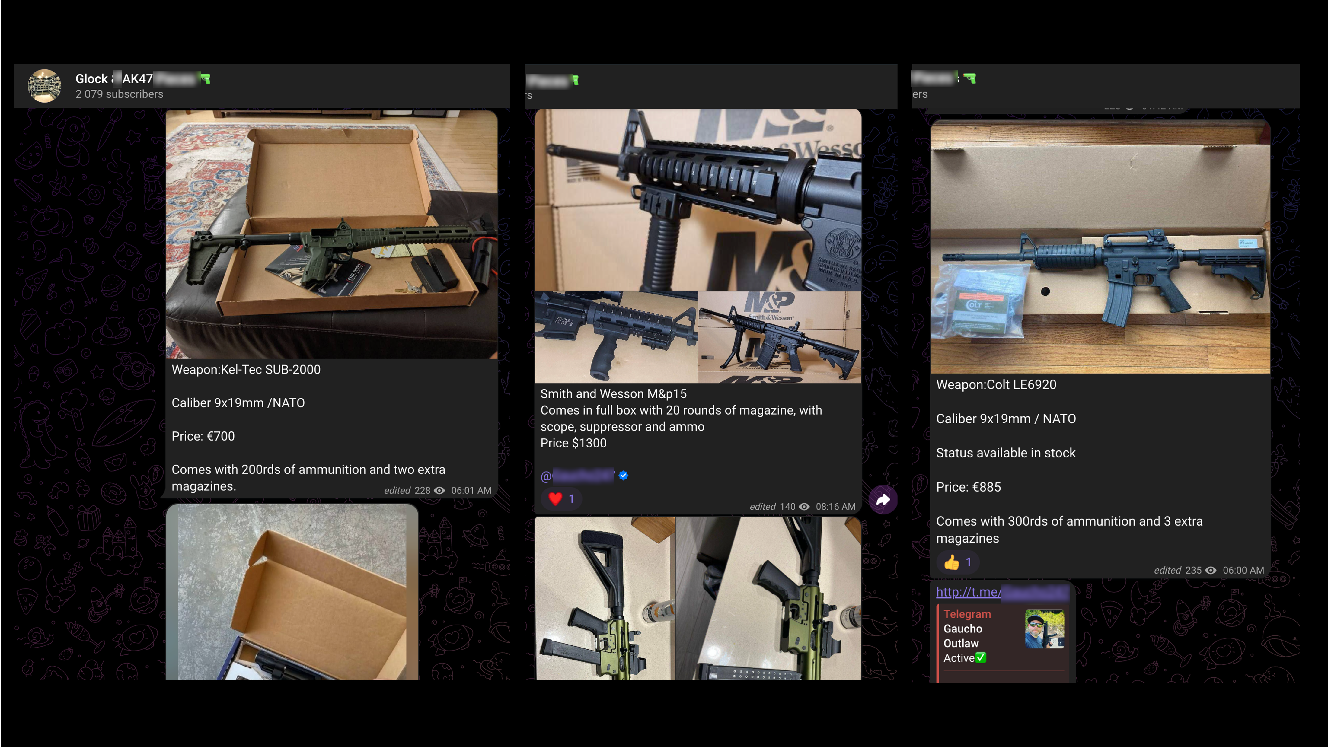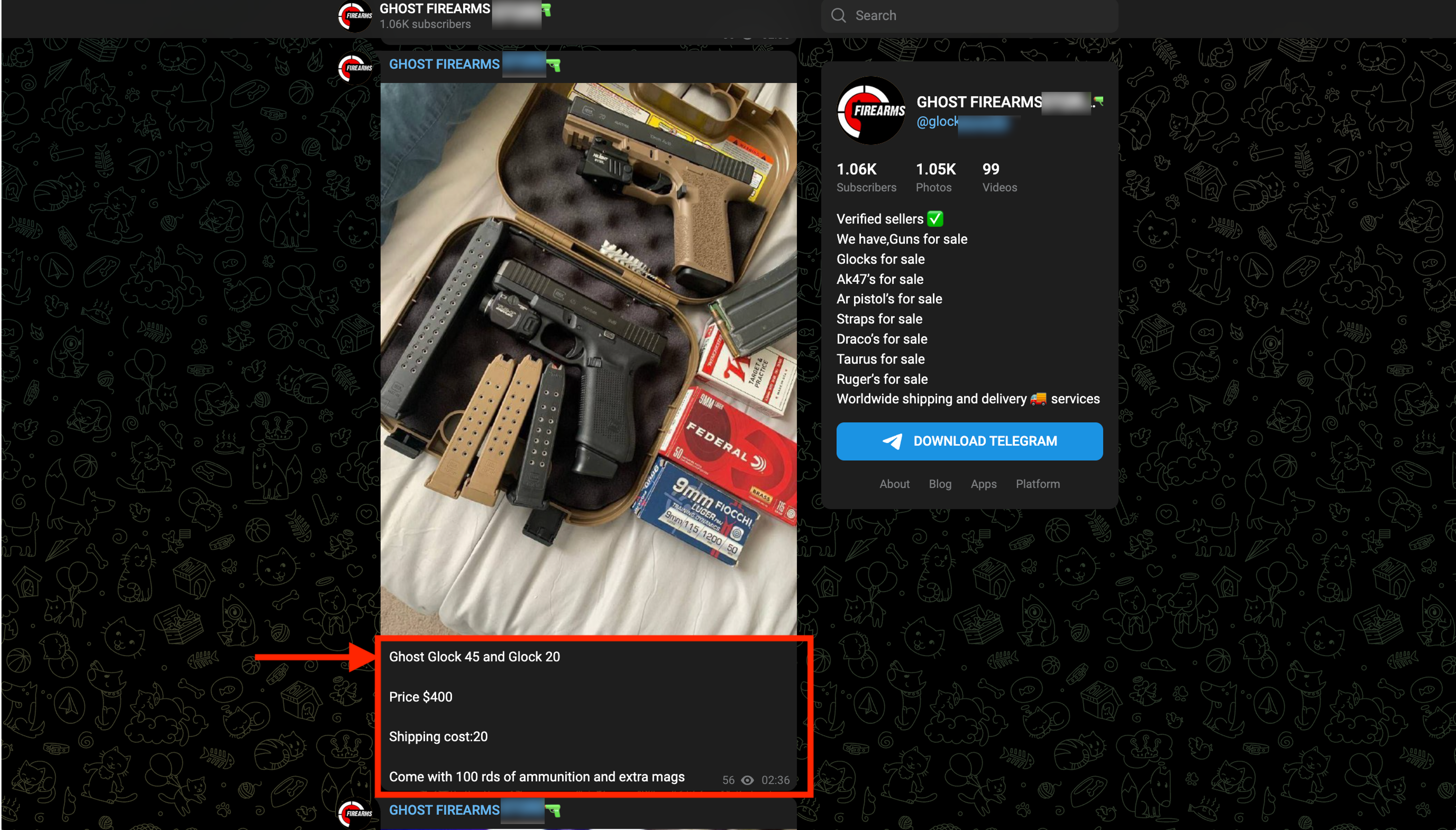 The Telegram channel had a pinned post that stated, “We offer domestic and international shipments of an excellent variety of firearms,” and boasted about its “diplomatically sealed” and “stealth” packaging.