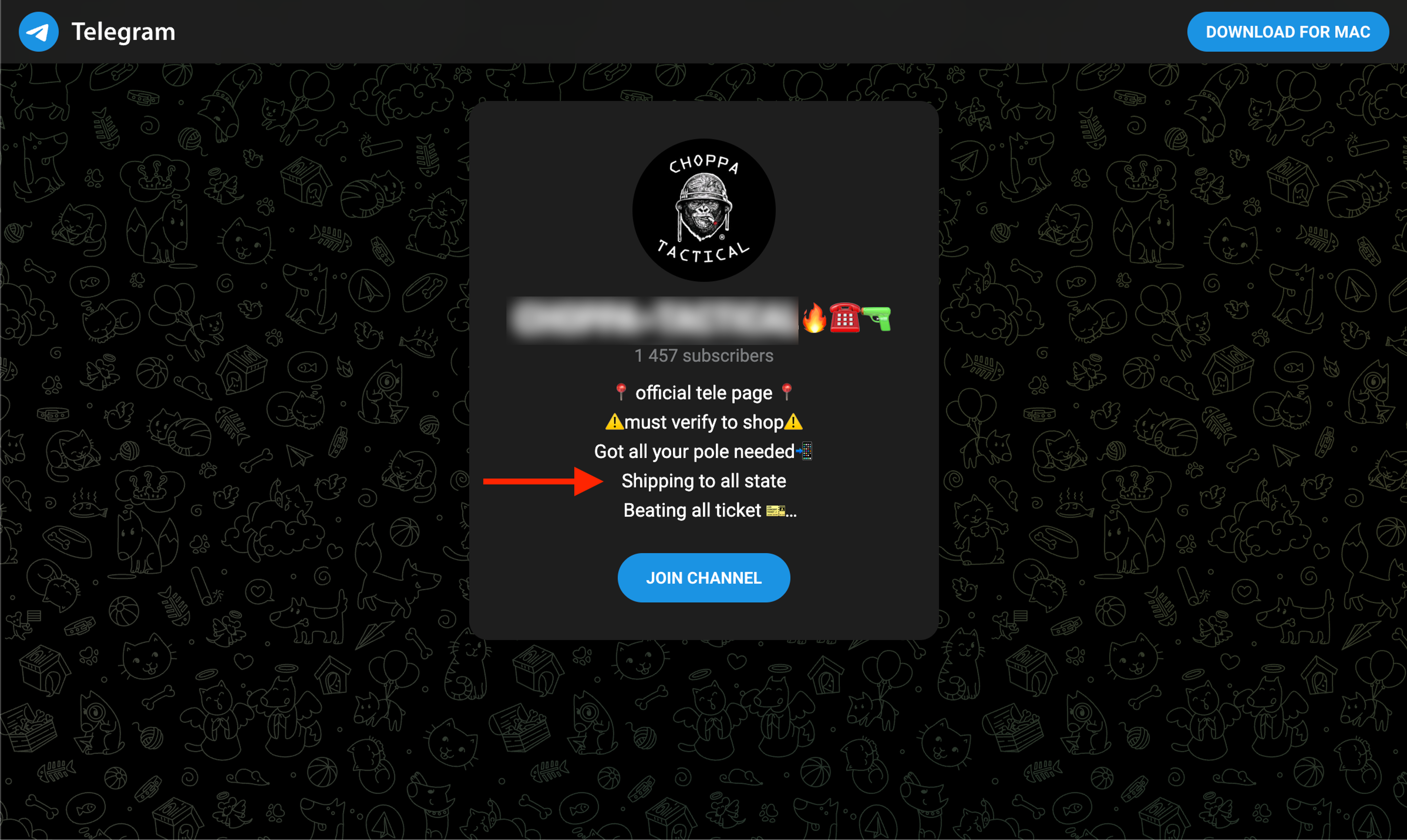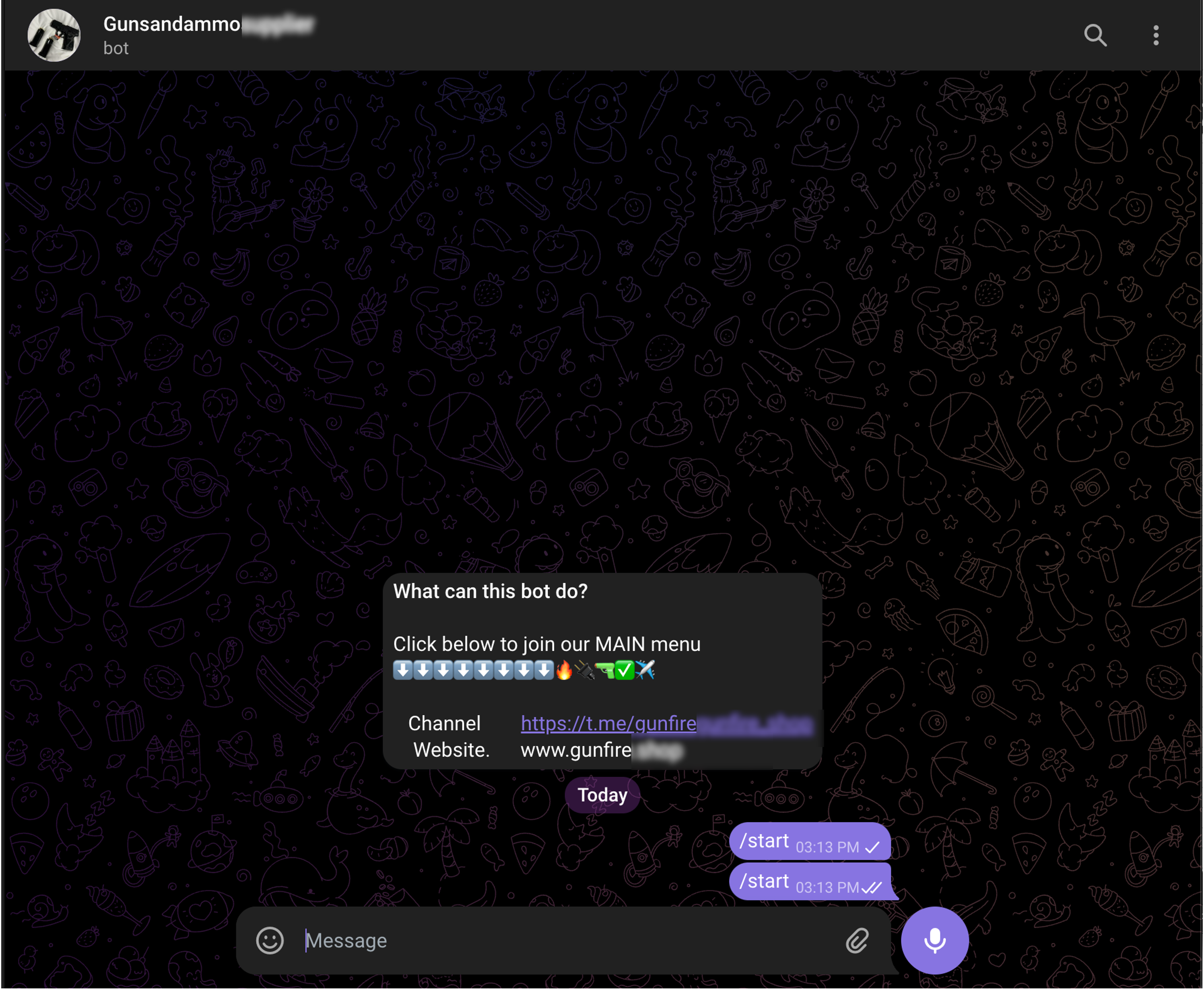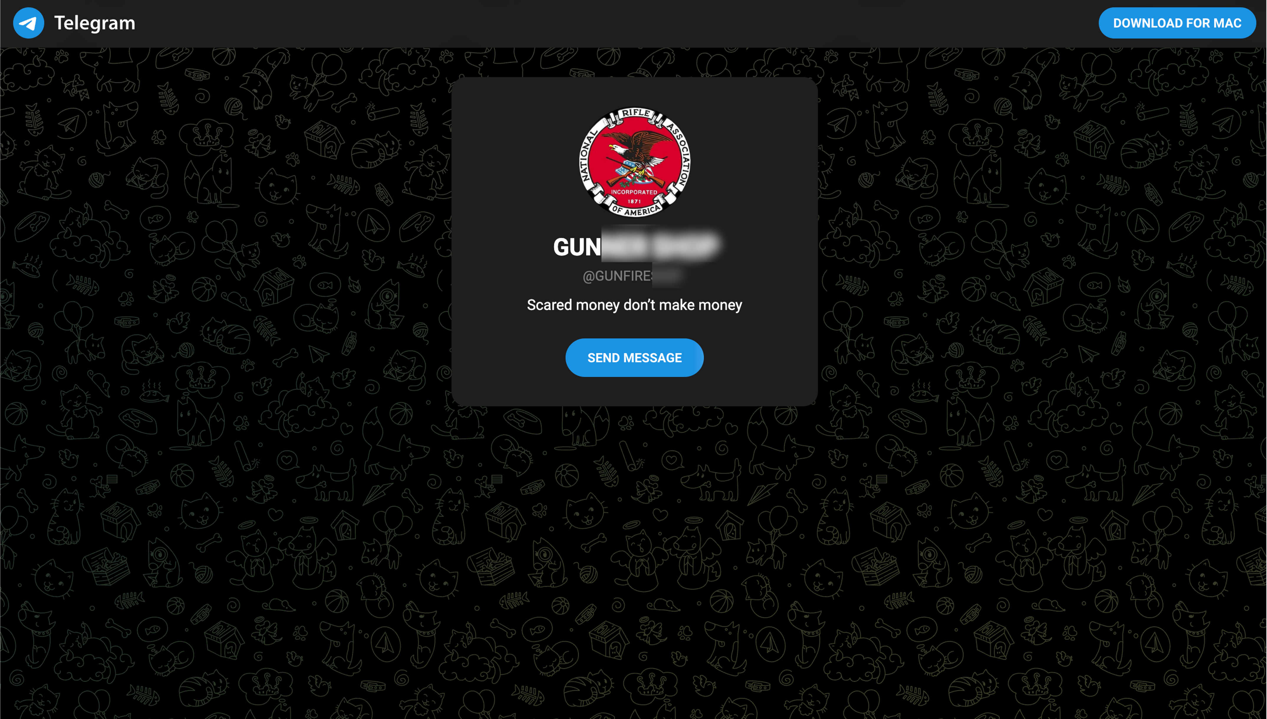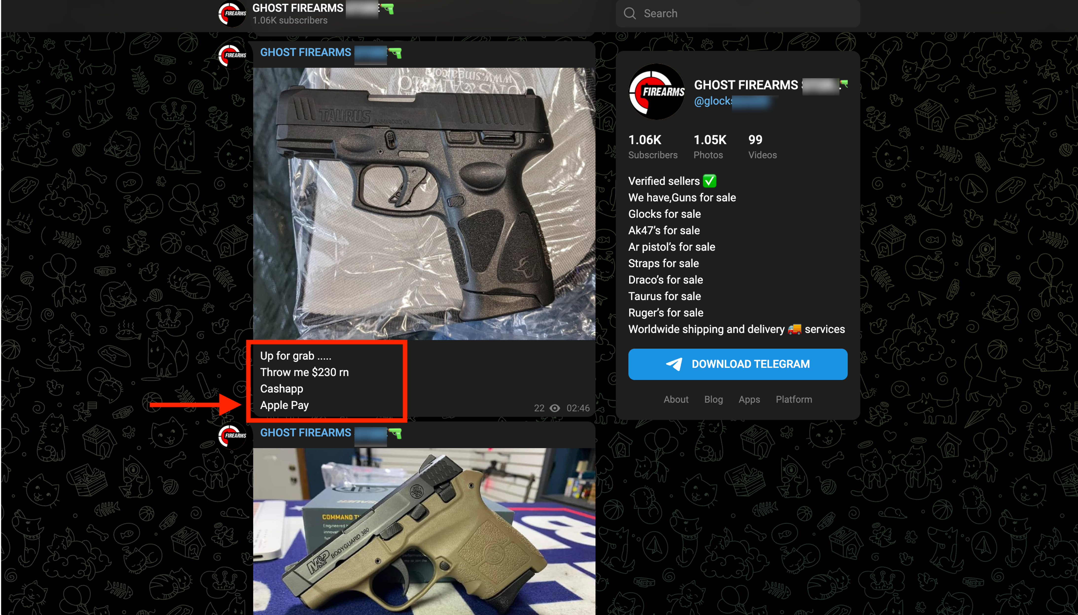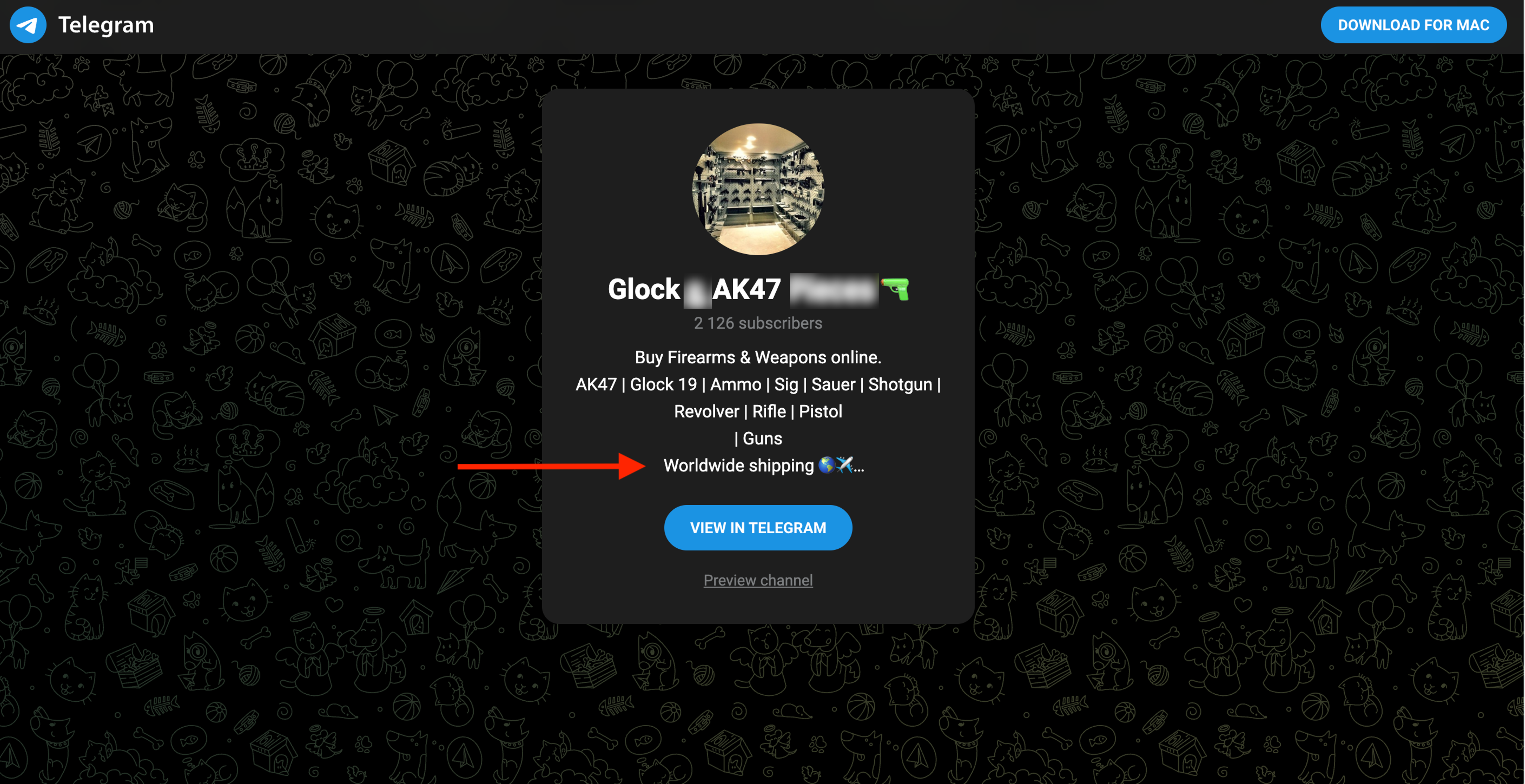 The Telegram channel had a pinned post that stated, “We offer domestic and international shipments of an excellent variety of firearms,” and boasted about its “diplomatically sealed” and “stealth” packaging.