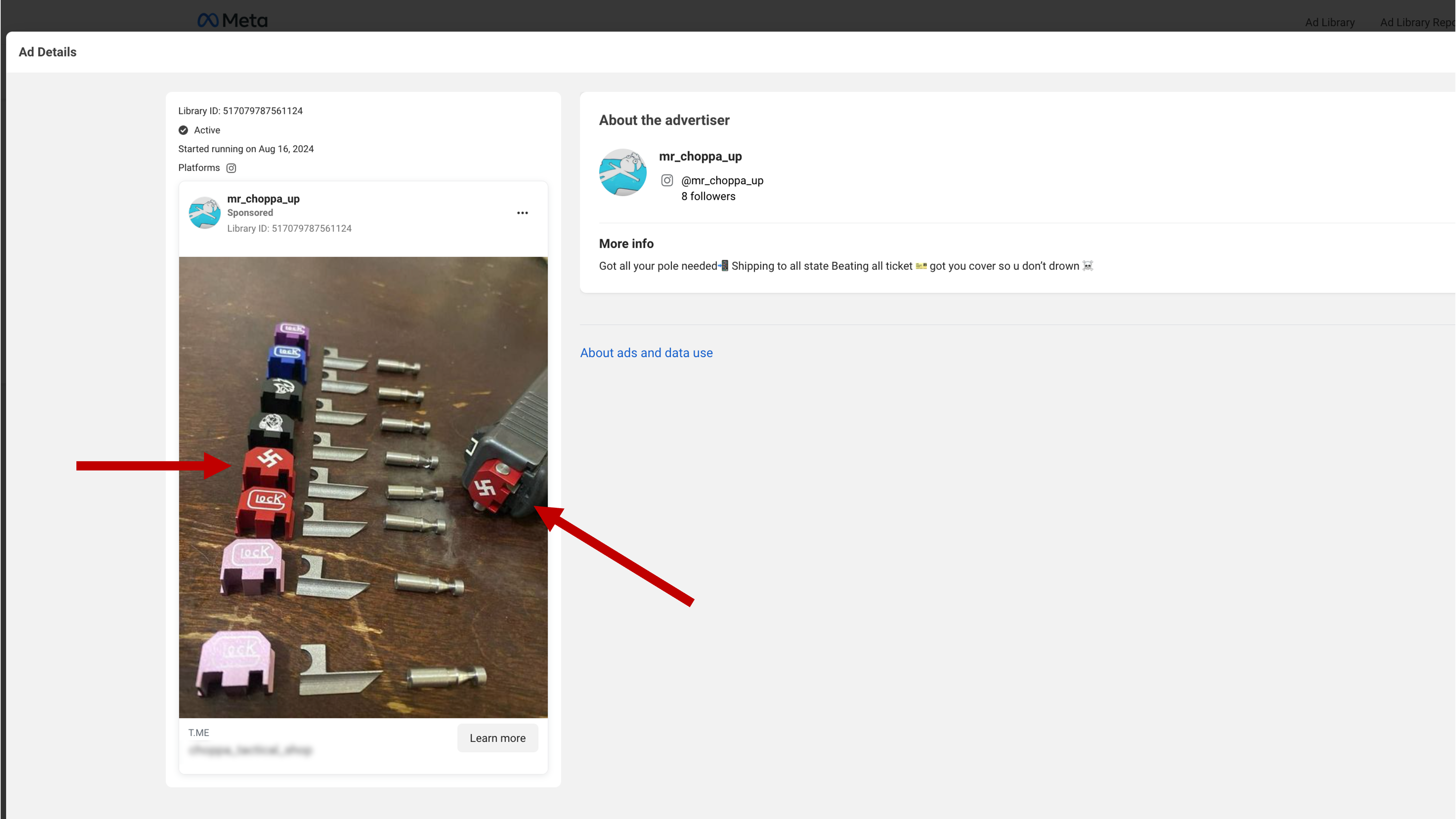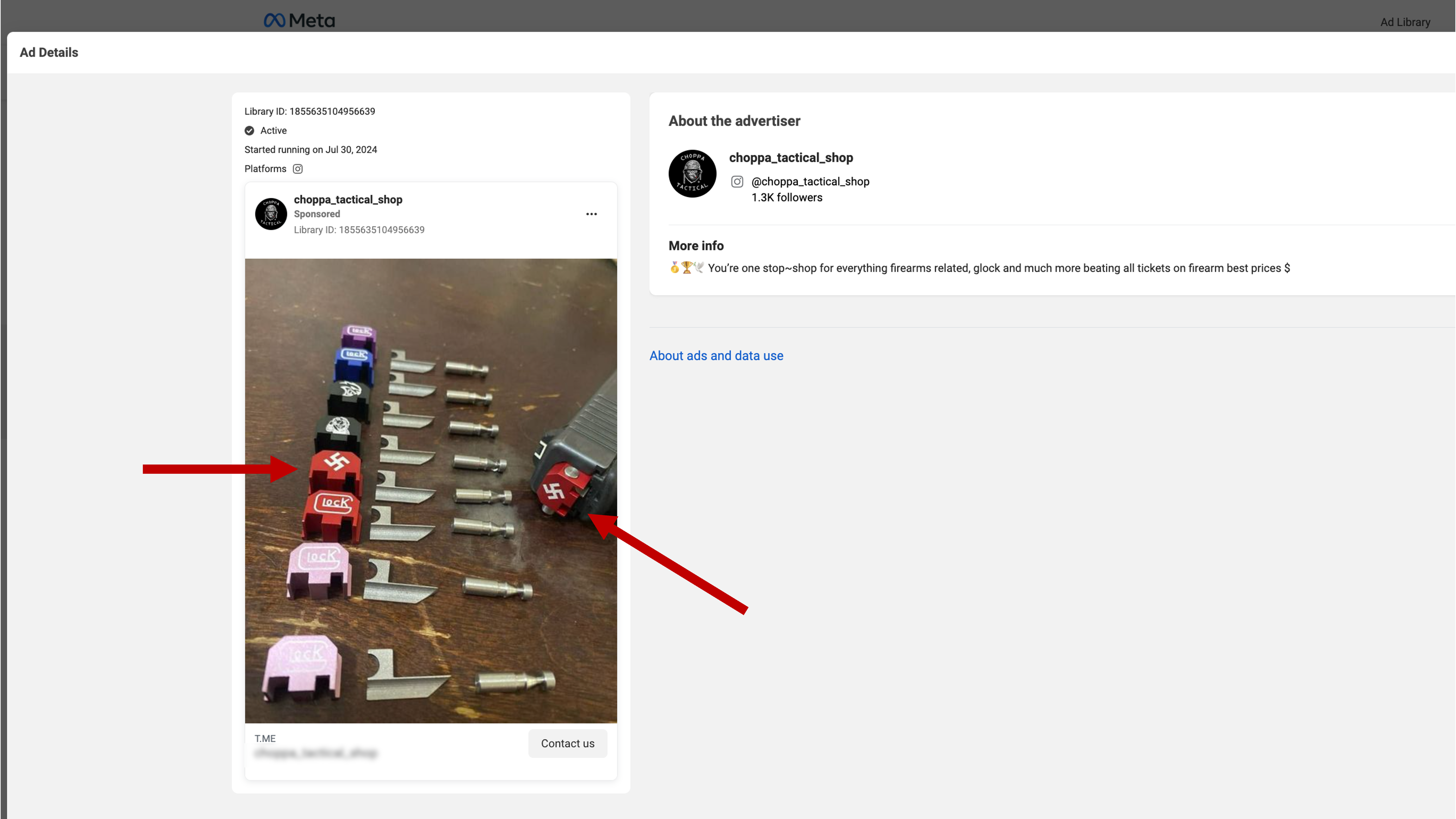 The investigation also identified a pair of ads that mixed hate symbolism with policy-violating gun content. The first ad, which ran on Instagram starting on July 30, 2024, showed a photo of switches lined up on a table, including some emblazoned with a swastika symbol associated with Nazi Germany. The ad linked to a Telegram channel that sold Glocks pre-affixed with switches plus other weapons. About two weeks later, another Instagram ad showed the same photo of Nazi switches and linked to the same Telegram account.