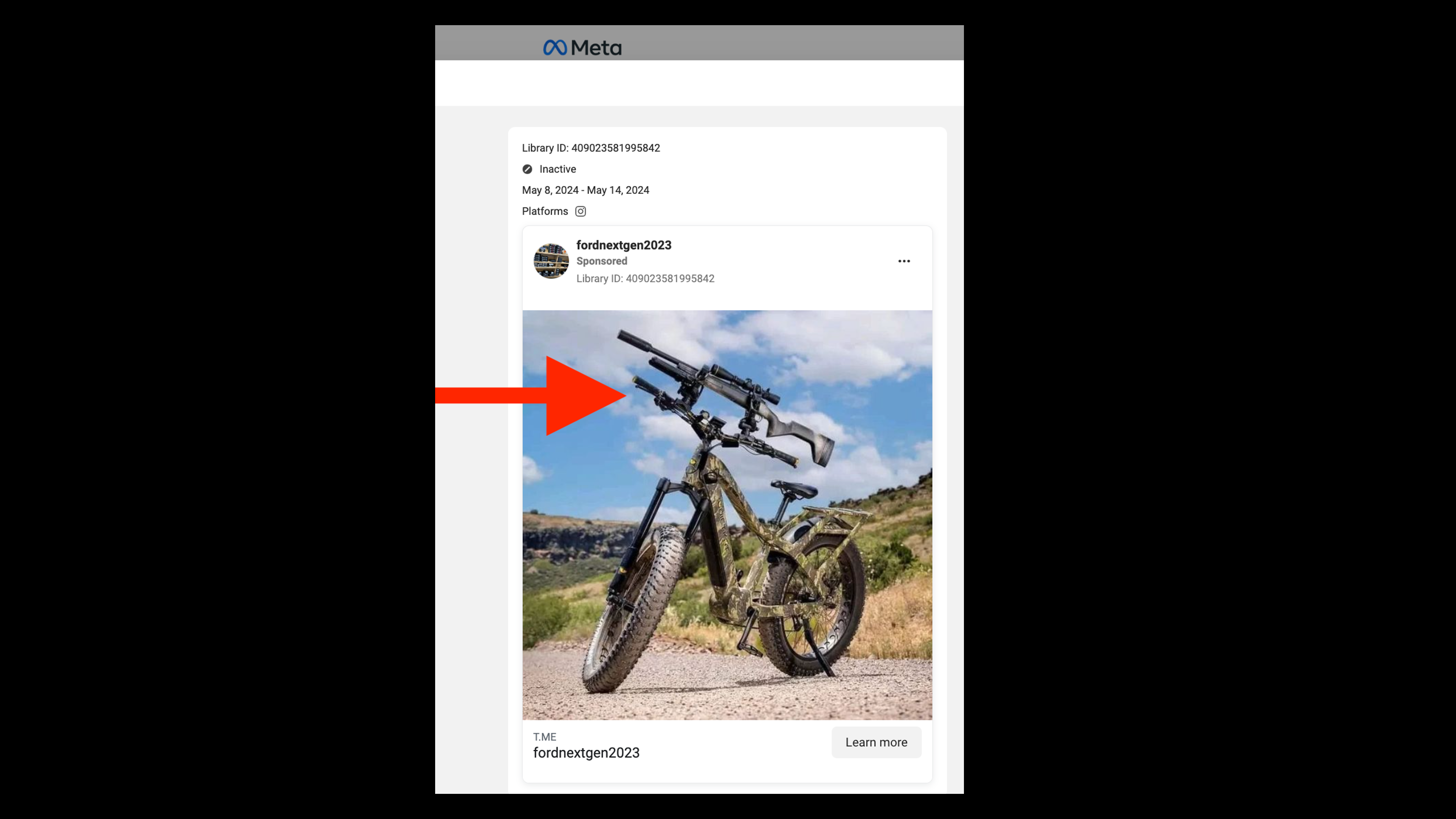 This Instagram ad from May 2024 showed a mountain bike with a rifle mounted on the handlebars.