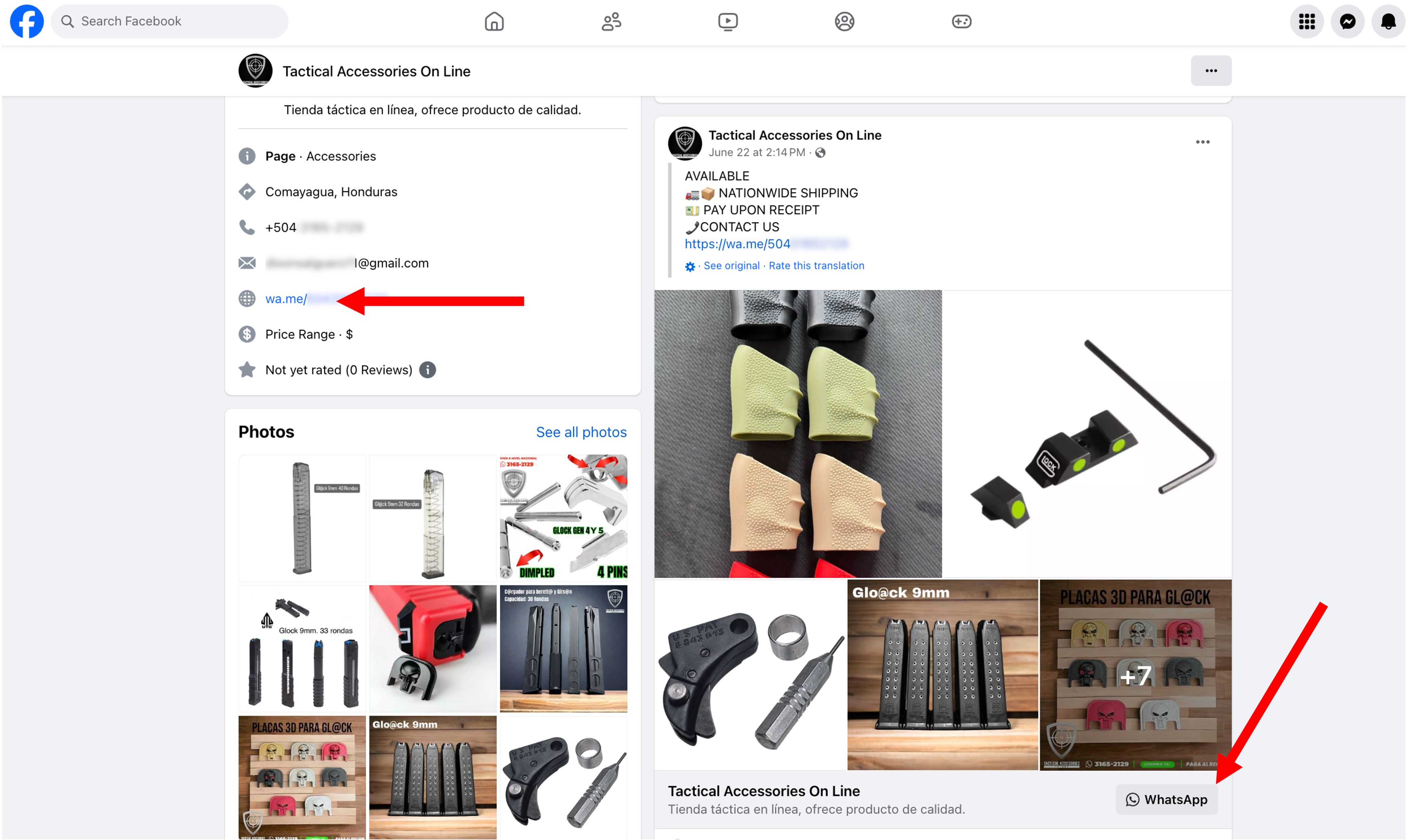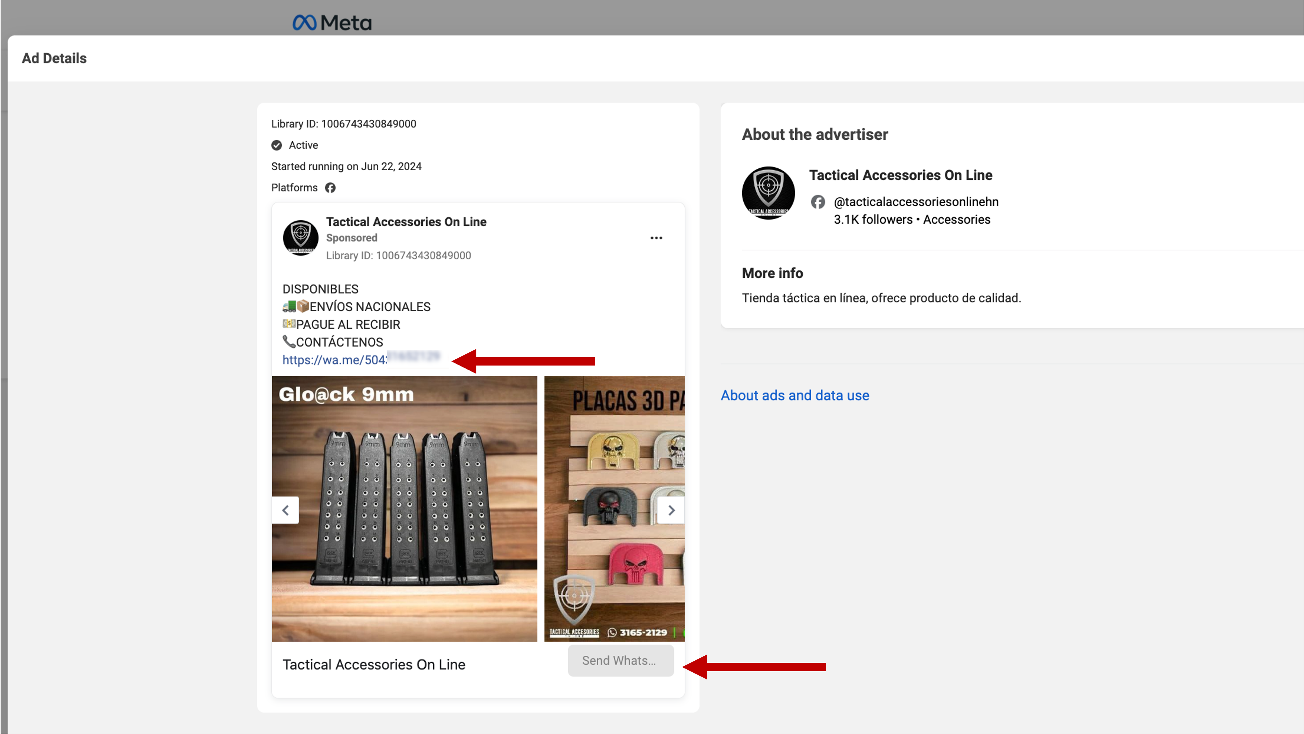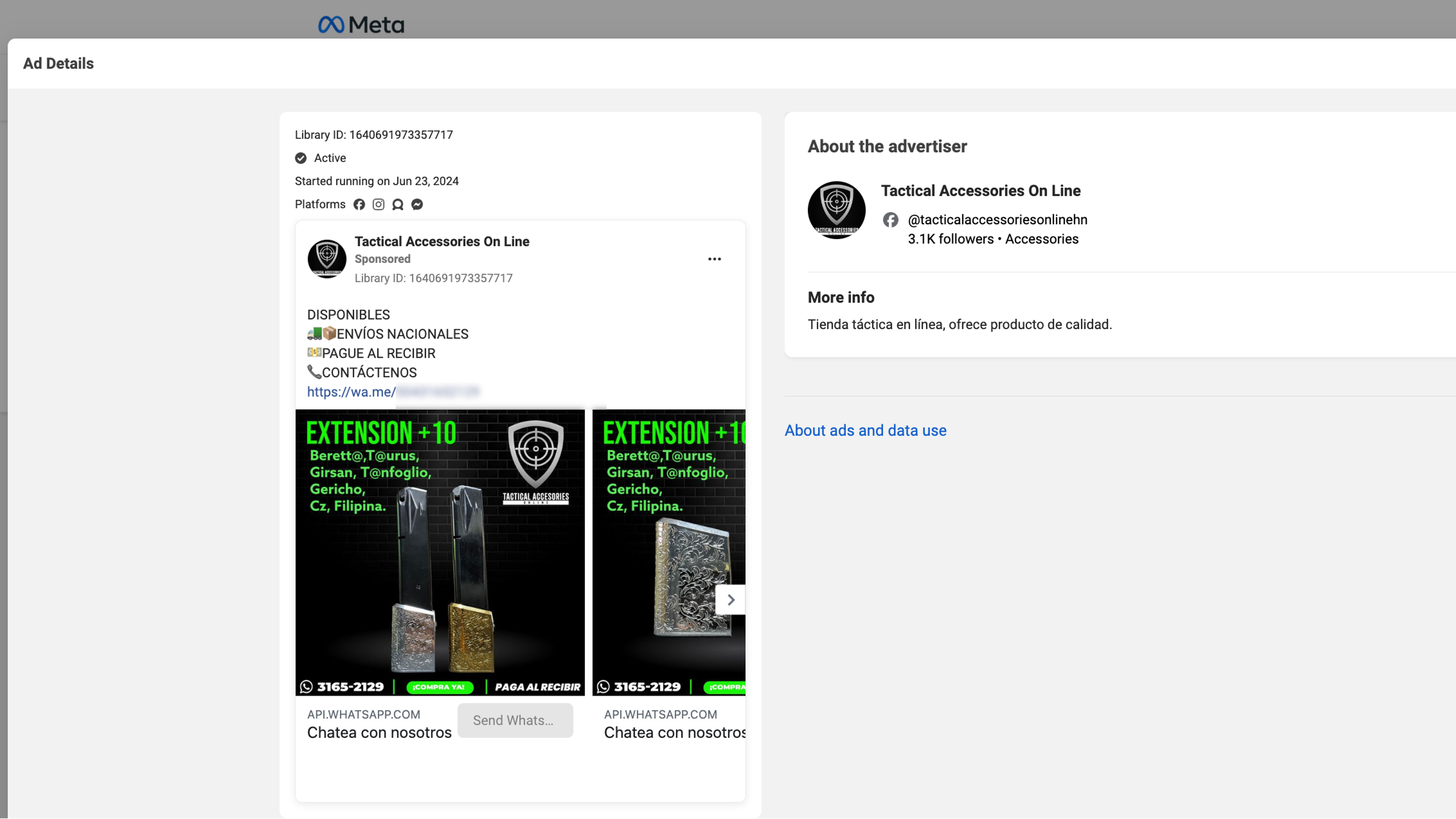 For example, an ad that started running on Facebook on June 22, 2024, with images of ammunition magazines and pistol slide back plates, linked to a WhatsApp business account for “Tactical Accessories On Line.” The account displayed a catalog of gun parts including magazine extensions for Berettas, Glocks, and other firearms.