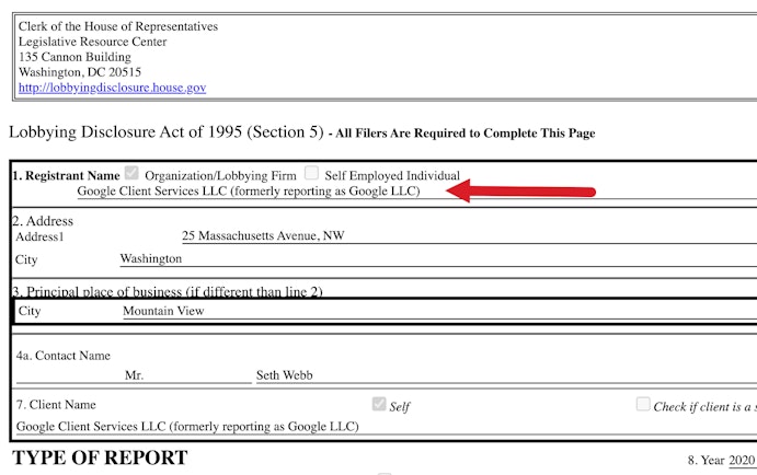 In early 2020, Google moved its in-house lobbyists into a new subsidiary it called Google Client Services LLC.