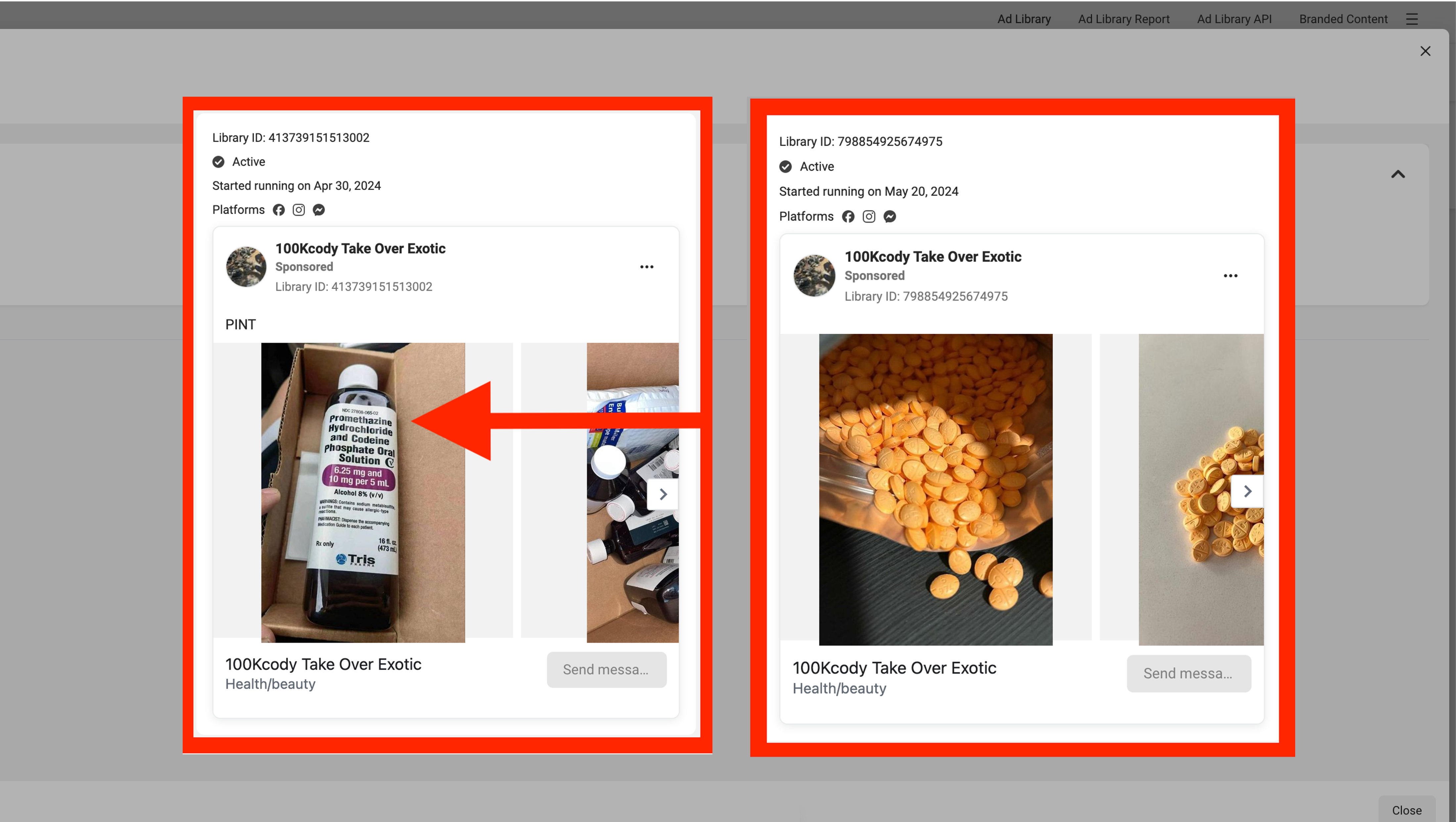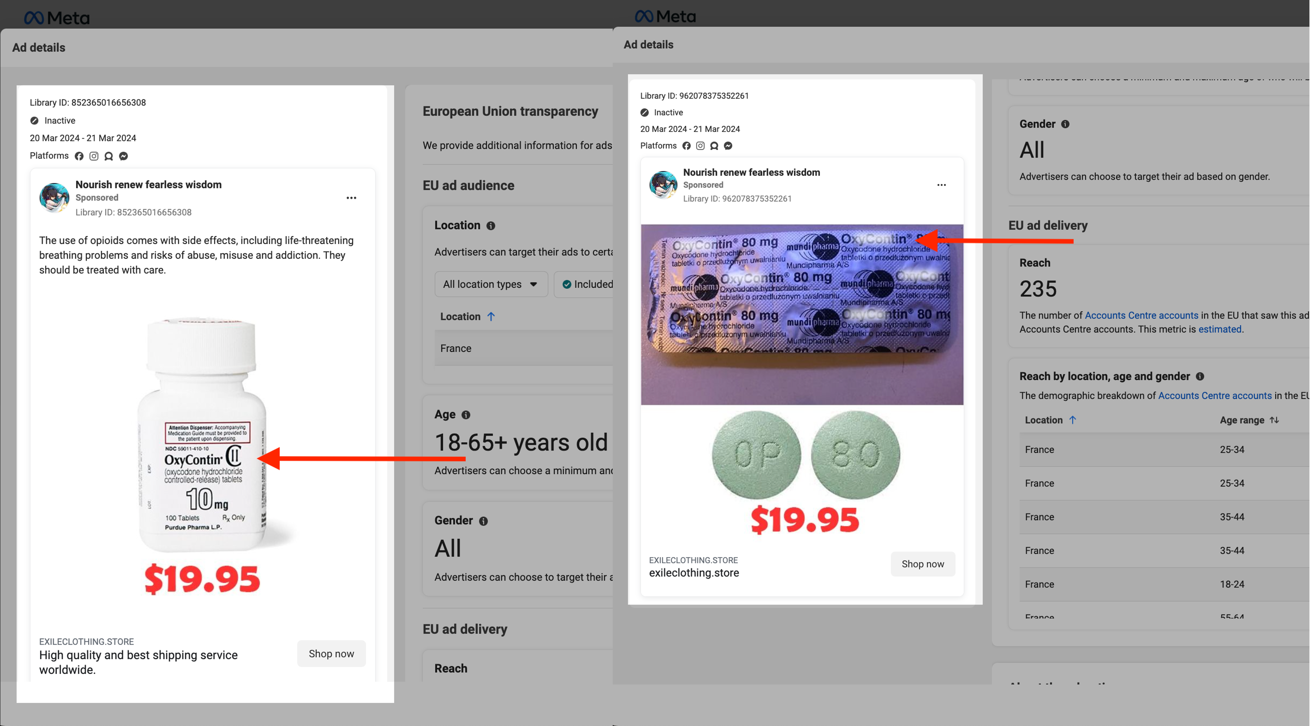 An ad that ran on Facebook, Instagram, and Messenger showed a carousel of drug images including packages of OxyContin.