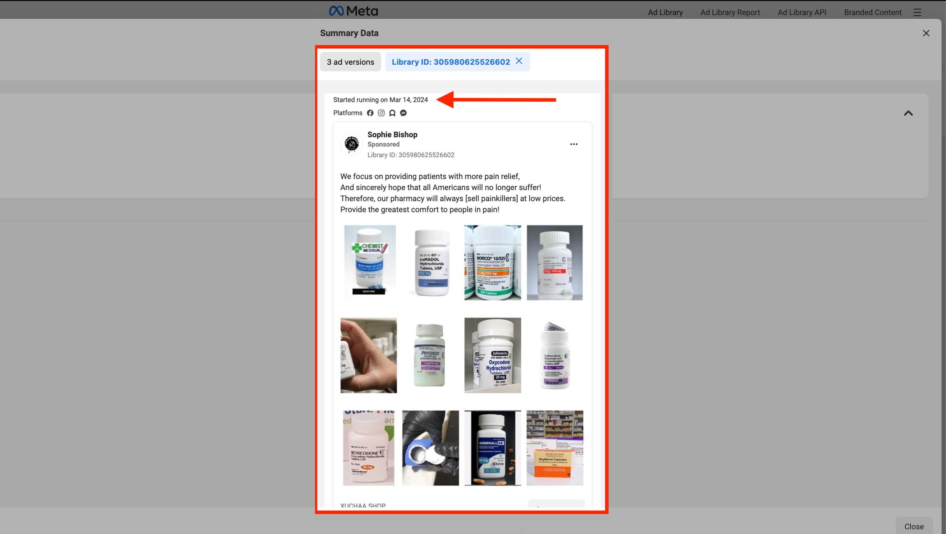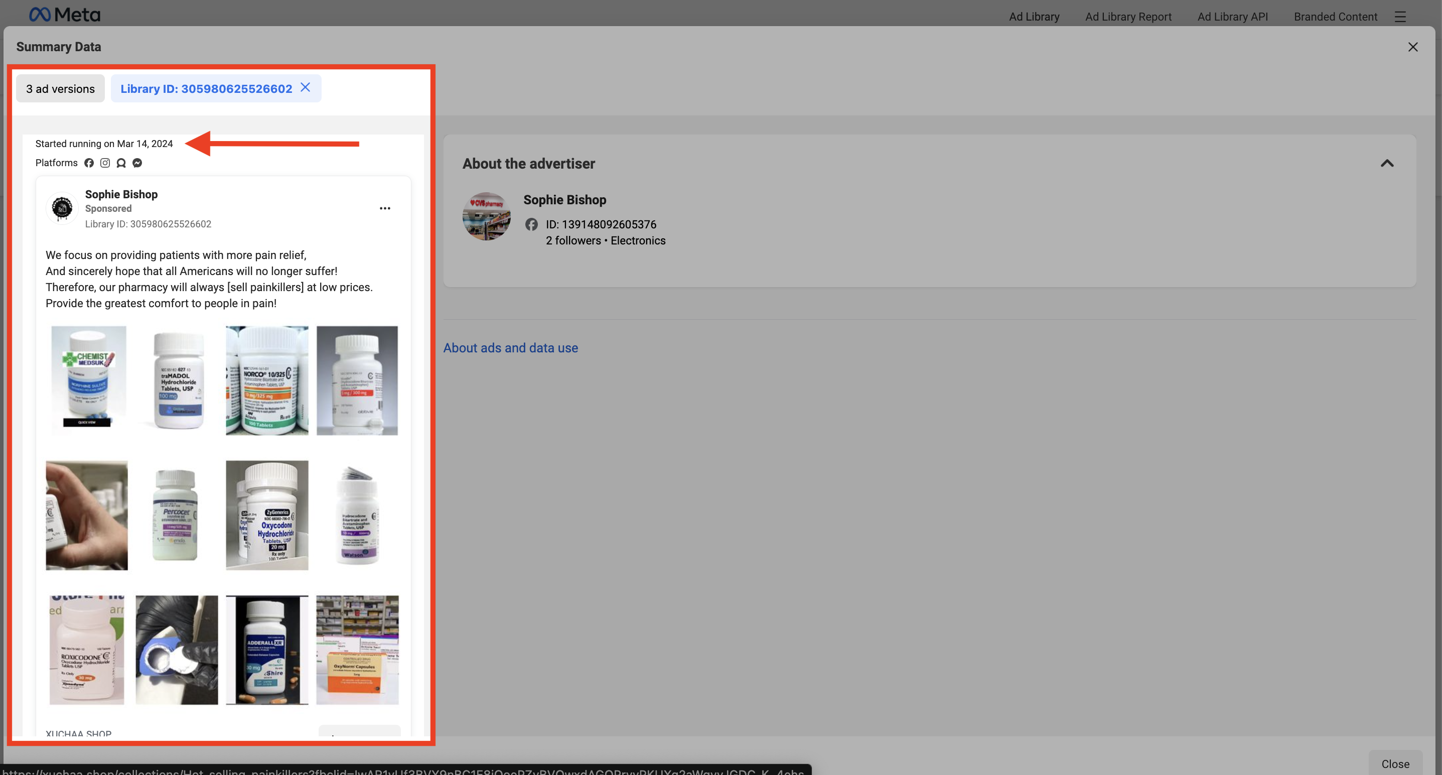 The same Sophie Bishop page ran an ad starting March 14 that showed an array of prescription drugs including Norco, tramadol, oxycodone under various brand names, and Percocet, which combines oxycodone and acetaminophen. The ad, which pointed to the same online store as the previous ad, stated, “We focus on providing patients with more pain relief” and “sincerely hope that all Americans will no longer suffer!” Touting its pharmacy’s low prices, it ended with, “Provide the greatest comfort to people in pain!” The ad ran on Facebook, Instagram, Messenger, and Meta’s Audience Network.