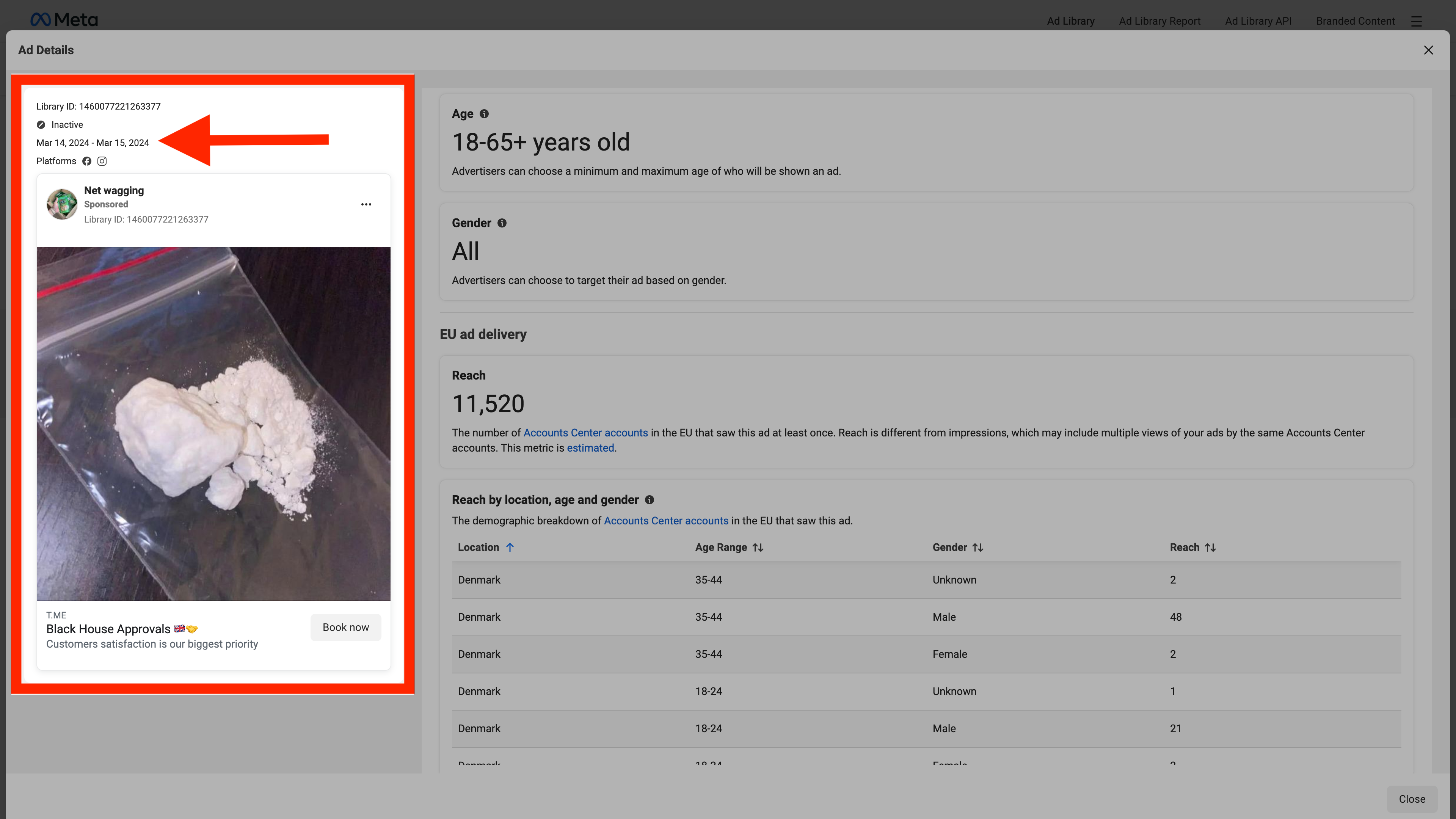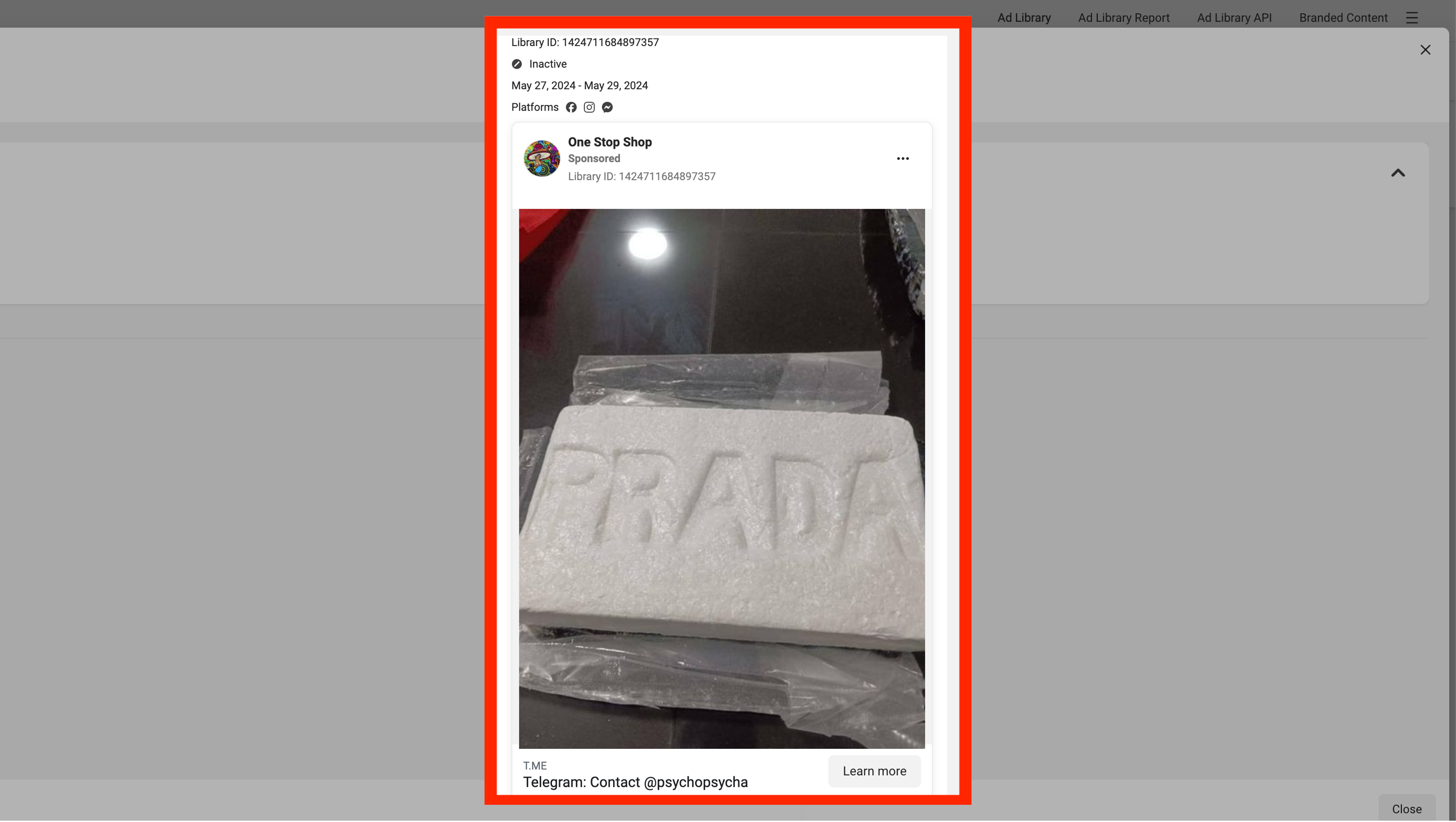 TTP also identified a Facebook page called “One Stop Shop” that ran 50 ads showing the same photo of what appears to be a brick of cocaine stamped with the word “PRADA.” (Prada-branded cocaine is associated with the Mexico-based Sinaloa drug cartel, though it is not clear if the cartel was involved in this ad campaign.) According to Meta’s Ad Library, the ads, which ran in the UK and EU between March and June 2024, reached a collective 117,959 users in EU countries including Ireland, Austria, and the Czech Republic.