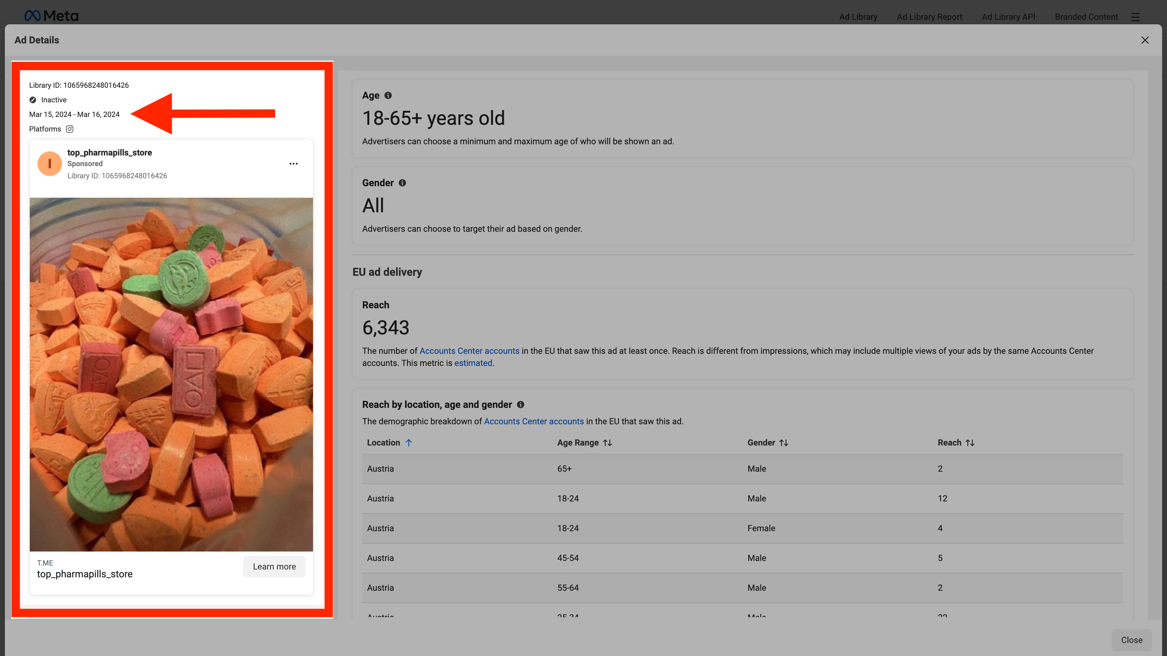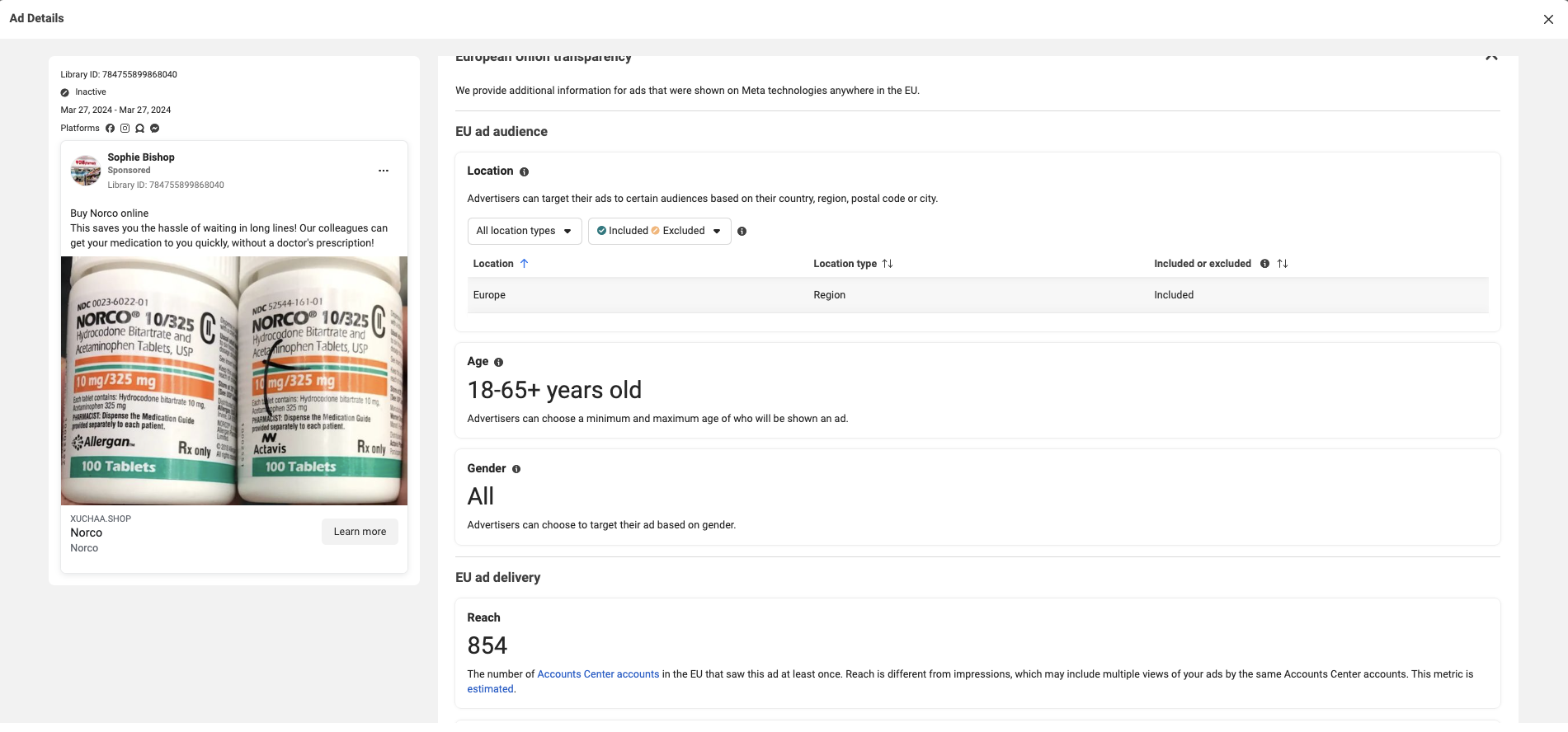 The fact that Meta provides targeting and reach information for ads that run in the European Union gives a limited but useful window into how drug dealers use the ads to find customers. Of the 452 ads for drugs identified by TTP, 366 of them ran in the EU, collectively reaching more than 2,256,800 users in EU member countries and regions.