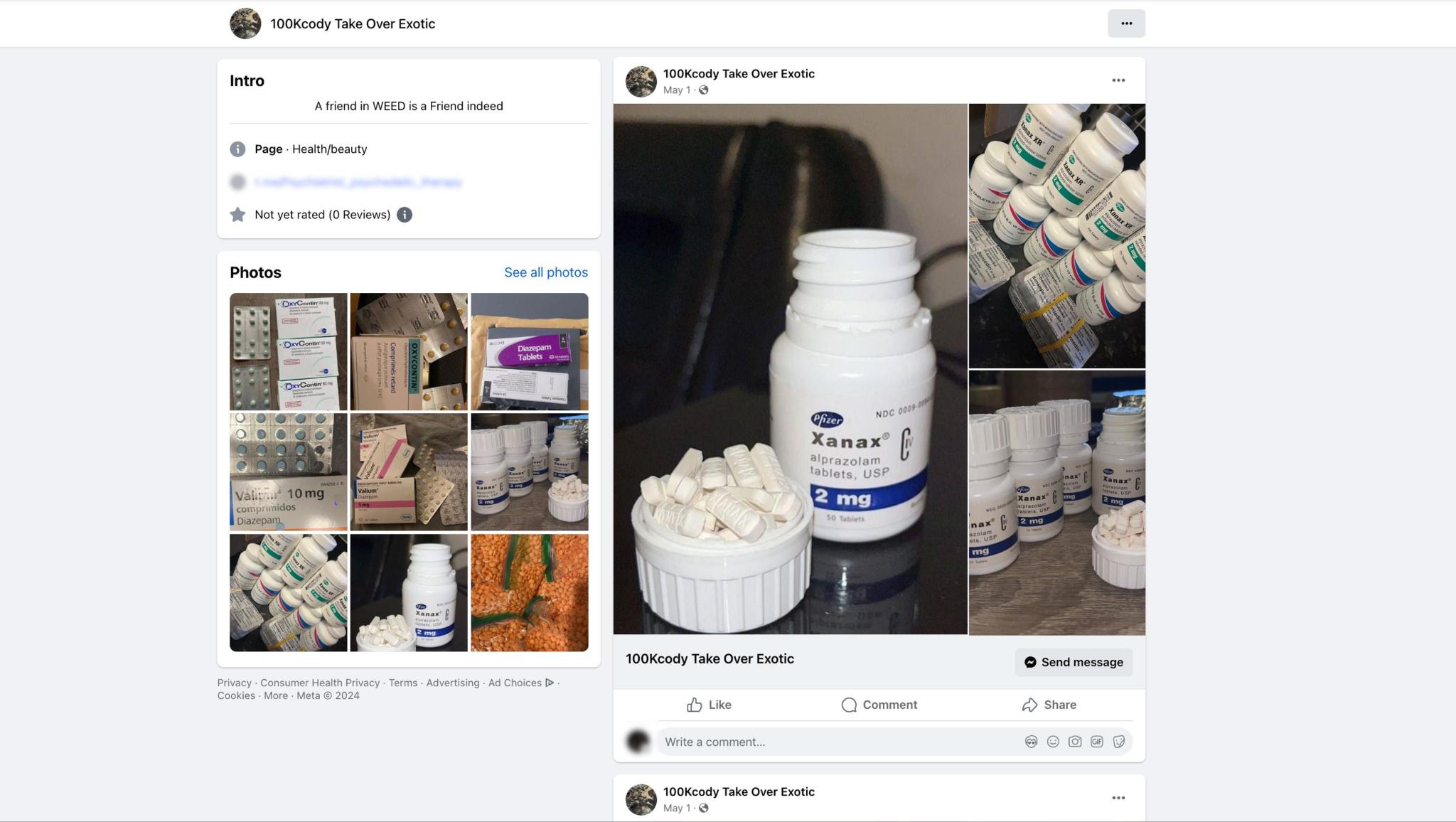 The advertiser in this case was a Facebook page called “100Kcody Take Over Exotic,” which states, “A friend in WEED is a Friend Indeed.” Categorized as a "health/beauty" page, it is filled with photos and videos of drugs, including packages of Valium and bottles of Xanax. It also links to a Telegram account that gives prices for drugs and takes orders.