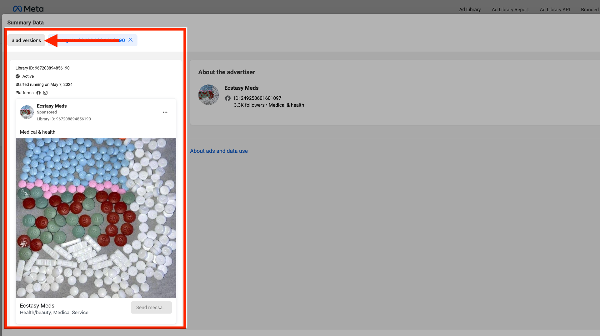 Some advertisers even used the name of a drug in their name. For example, a Facebook page called “Ecstasy Meds” ran ad for pills on Facebook and Instagram starting on May 7, 2024. The account ran two other ads with the same content, the Ad Library shows.