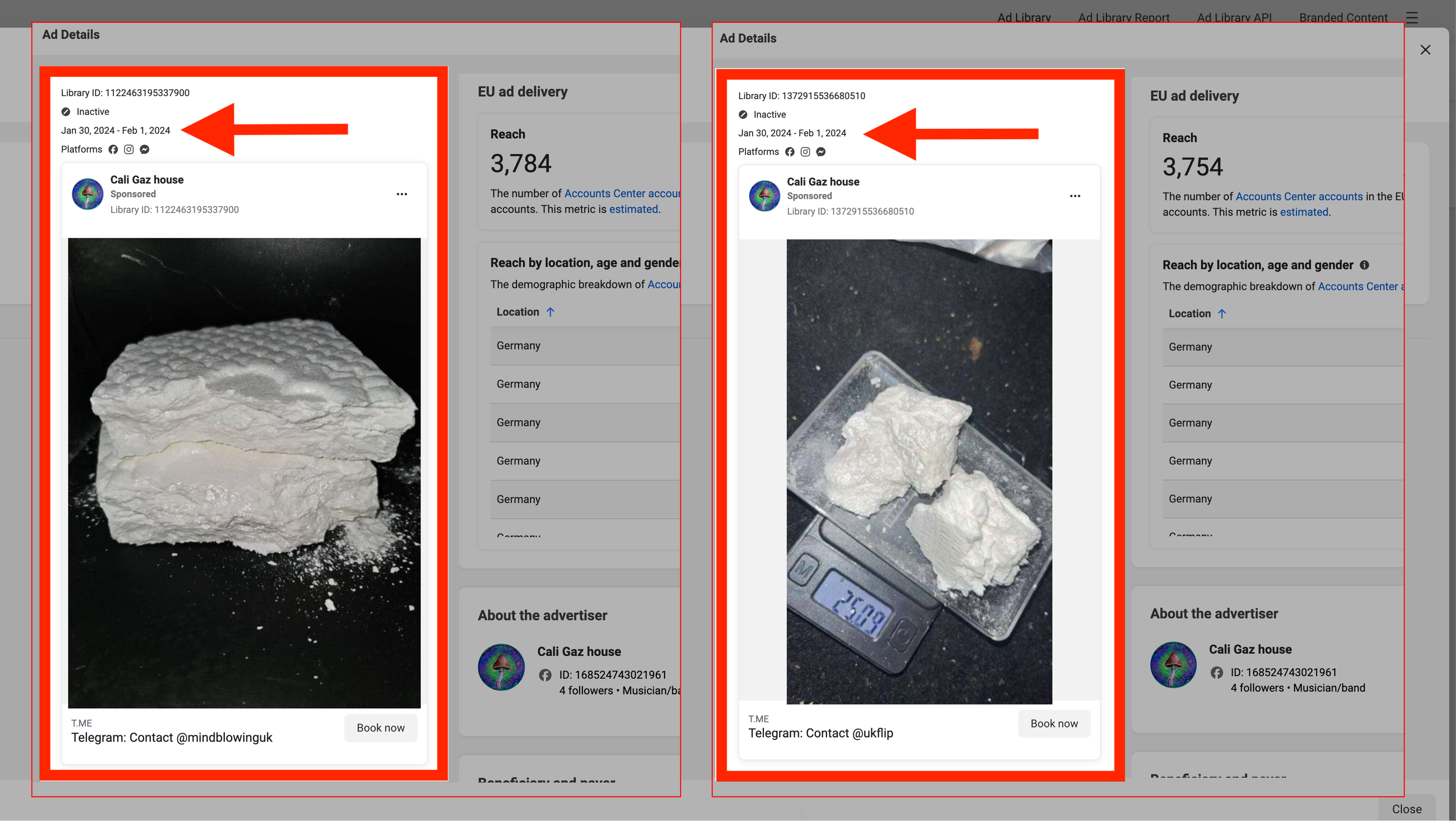 That same day, Meta ran two ads on Facebook, Instagram, and Messenger for chunks of a white powdery substance that appeared to be cocaine. The ads directed users to contact the dealer via Telegram accounts, including one called “Trippy house uk 🇬🇧 base 💊." The Facebook page behind the ads, “Cali Gaz House,” is filled with images of drugs and had a cover photo at one point that read, “Order Pay Receive.”