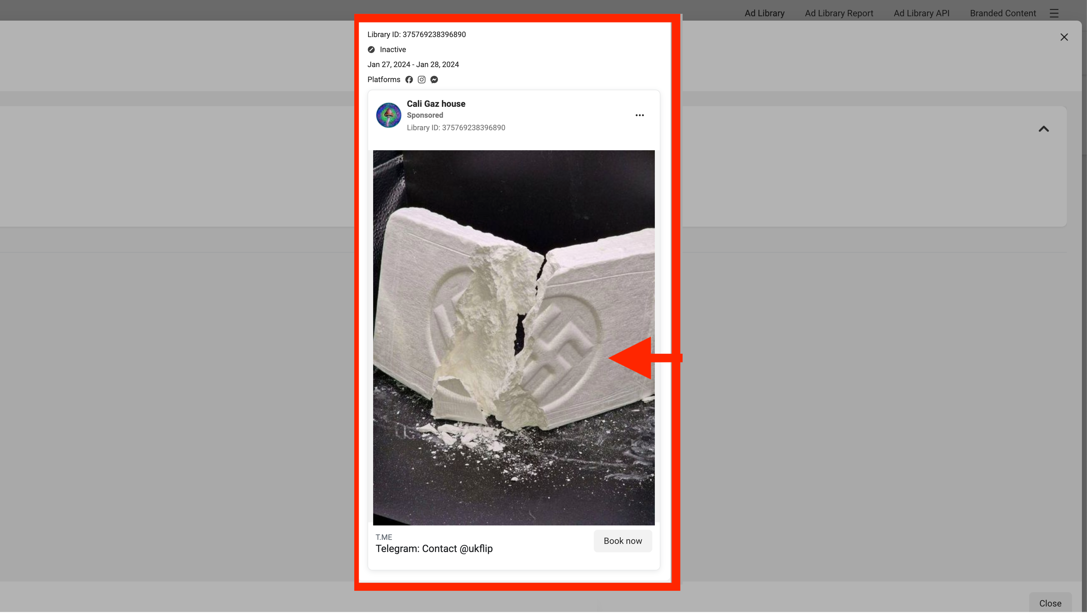 The page has run at least six similar ads, including one showing what looks like a cocaine brick stamped with a Nazi swastika symbol.