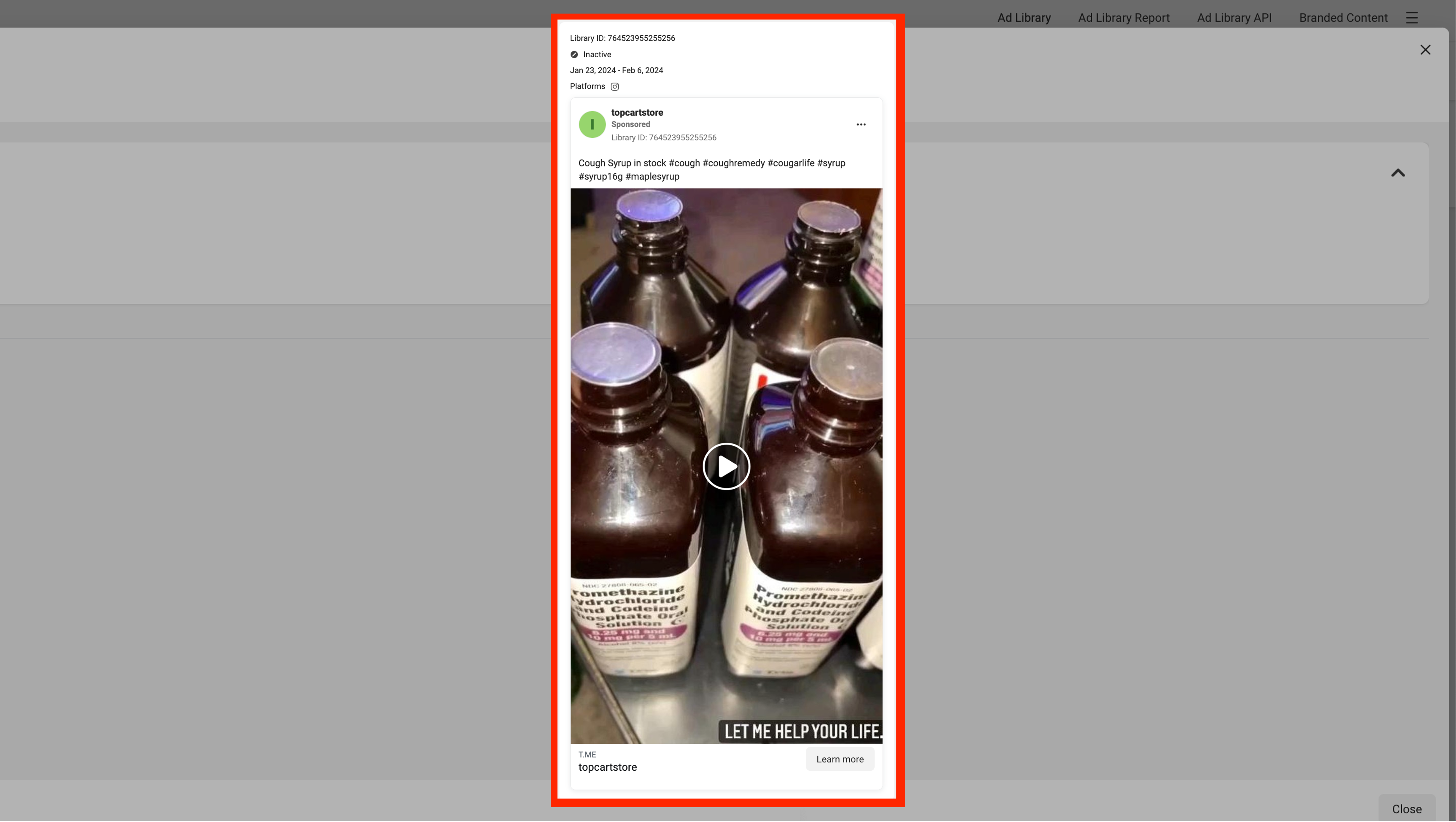 Because of the limitations of Meta’s Ad Library, TTP likely captured only a fraction of the drug ads that ran in the March-June time period covered by this report. According to Meta, the Ad Library only shows ads that are actively running on its platforms, with the exception of ads about politics, elections, or social issues, which it stores for seven years, and ads that run in the European Union, which it stores for a year. That means many ads on Meta platforms simply disappear from the Ad Library once they are no longer active, and there is no way to track them. TTP did not monitor the Ad Library continuously during its investigation, so the drug dealer ads it identified are in all likelihood an undercount.