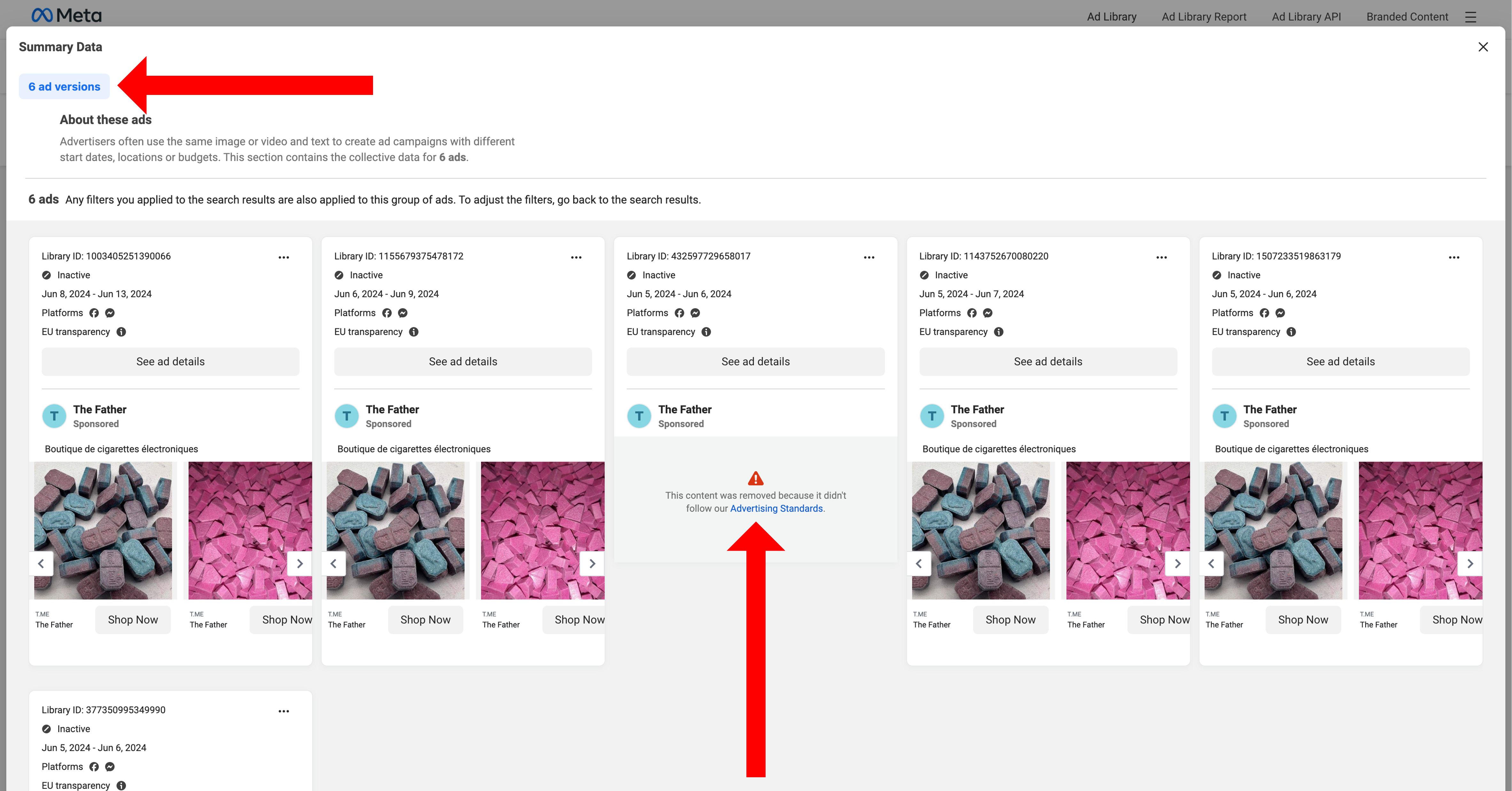 One set of six identical ads that ran on Facebook and Messenger in June 2024, showing a carousel of images of brightly colored pills and linking to a Telegram account, reached 192,831 users in 18 EU member states and regions, including France, Germany, and Italy, according to the Ad Library. The Library shows that Meta removed one of the ads for violating its advertising standards for Unsafe Substances but left the others alone. It was not clear why Meta took action on just one of the ads. The ads and the Facebook page behind them, called “The Father,” identify themselves as an electronic cigarette store.