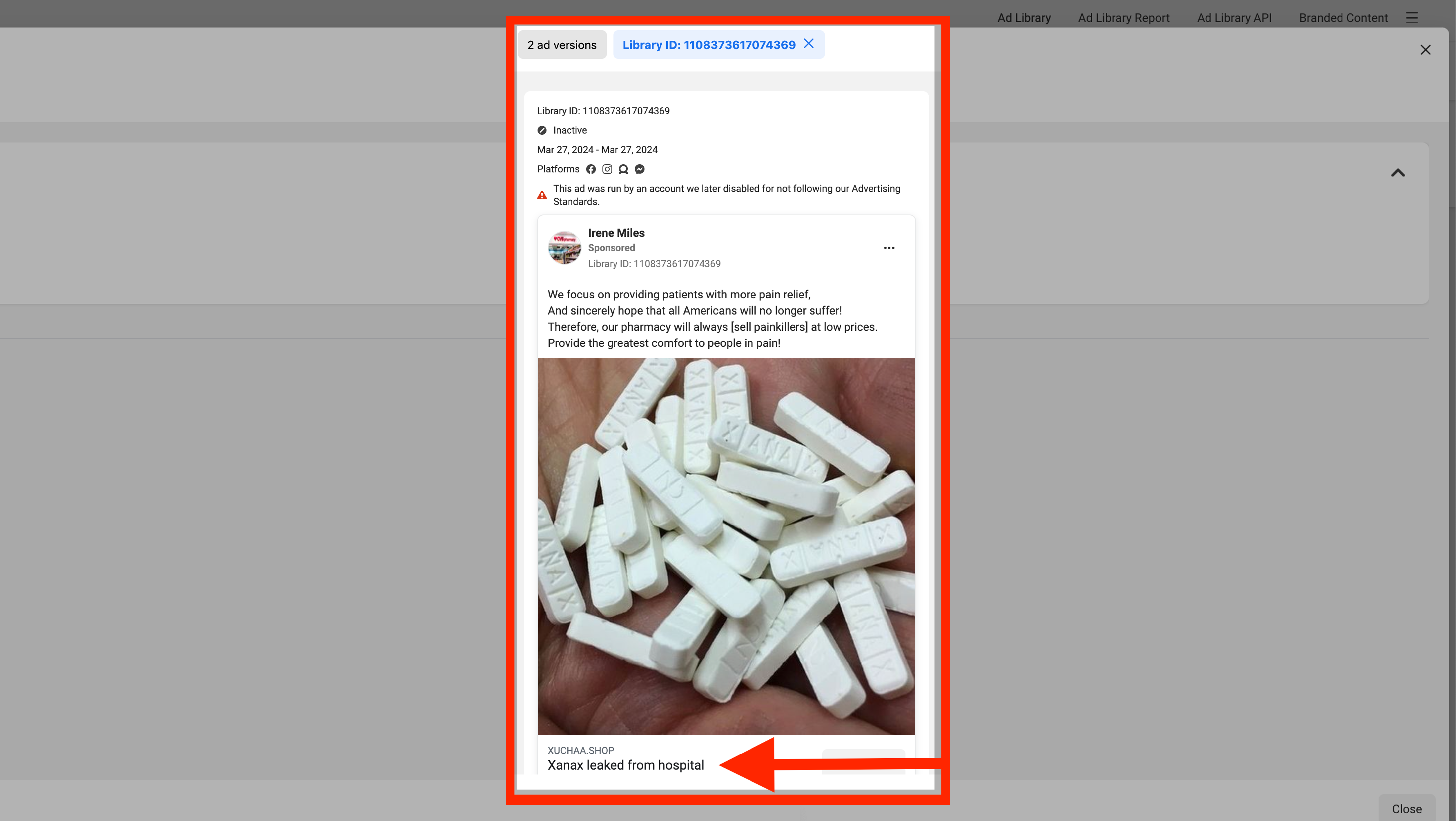 This “pharmacy” activity on Meta may also violate U.S. law. According to the Food and Drug Administration (FDA), the Federal Food, Drug, and Cosmetic Act prohibits offering prescription drugs for sale without a prescription. The agency has repeatedly warned about illegal online pharmacies that sell dangerous and potentially deadly counterfeit drugs, using legitimate-looking websites.