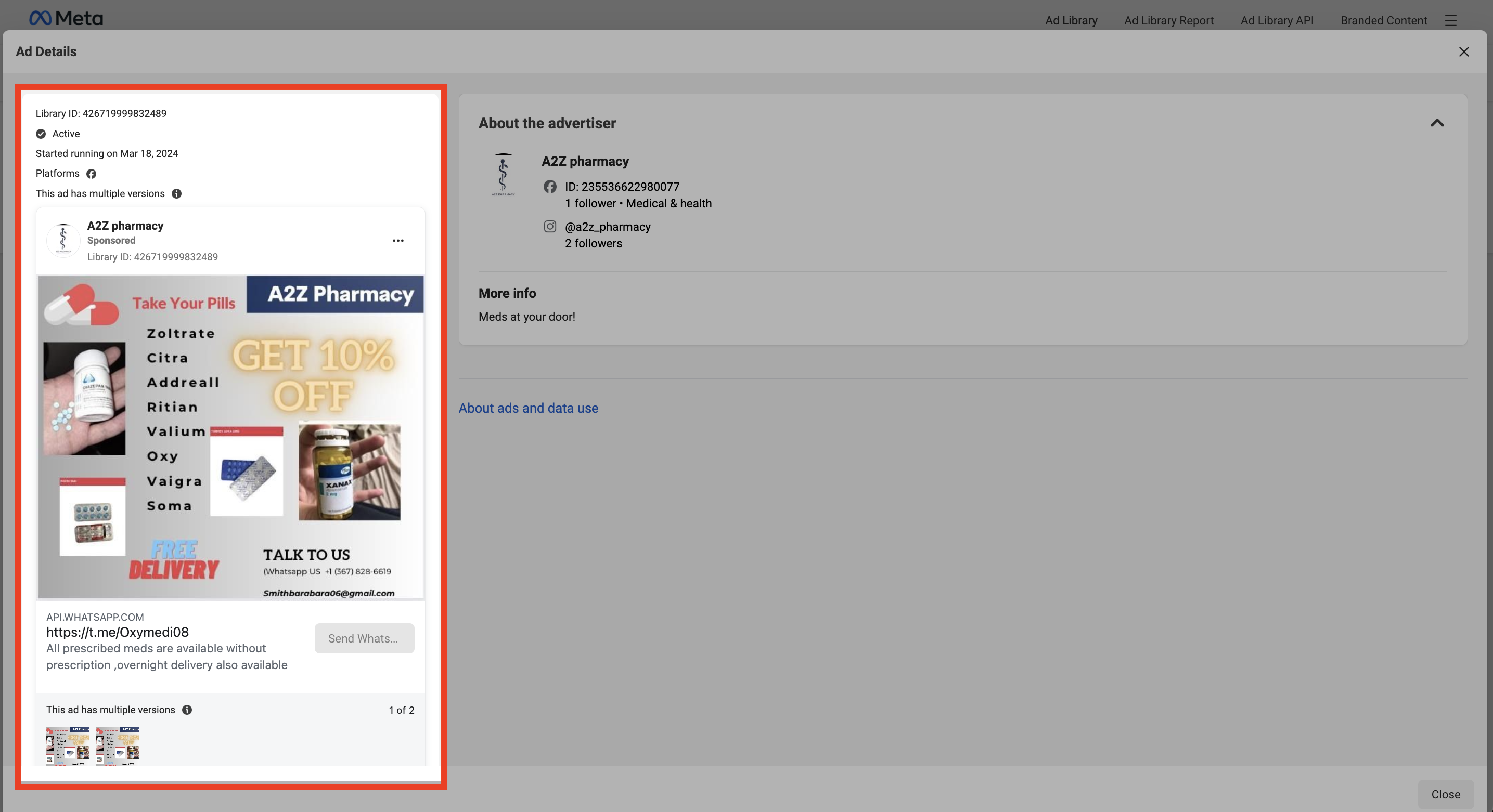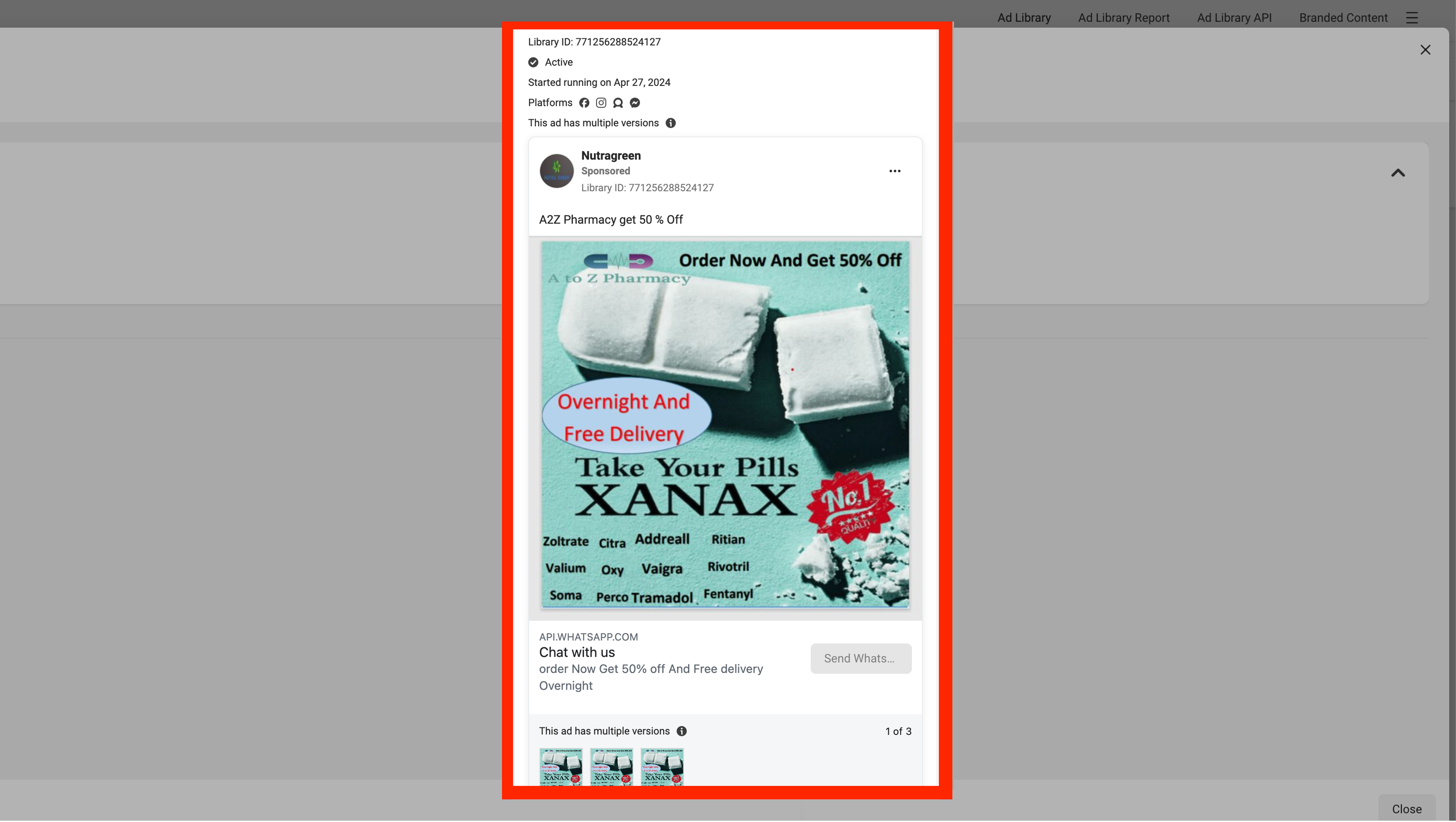 One ad identified by TTP promoted something called “A2Z Pharmacy.” The ad, which ran on Facebook, Instagram, Messenger, and Meta’s Audience Network starting on April 27, 2024, showed a white tablet with the text, “Take Your Pills,” and a list of drugs including Xanax, Valium, Percocet, OxyContin, tramadol, Adderall, and fentanyl. The ad, from a Facebook page called “Nutragreen,” promised “Overnight and Free Delivery” and “Order Now And Get 50% Off.” It connected to a WhatsApp number.