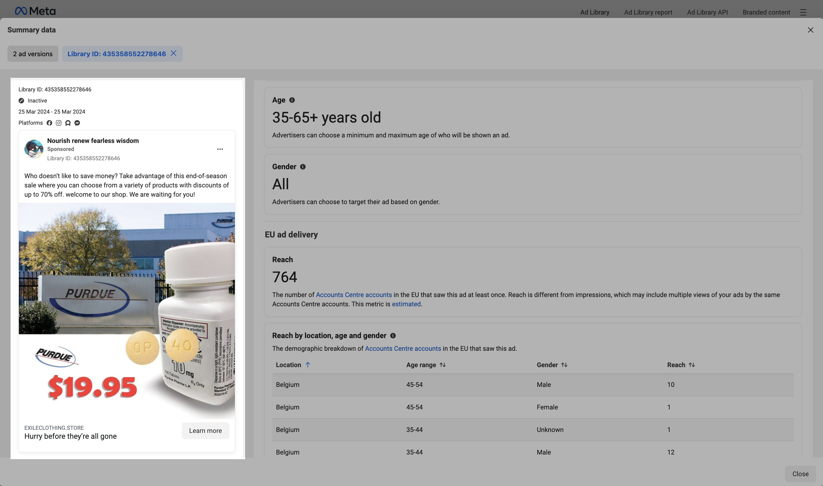 Another ad that ran on all four Meta platforms March 24-25, 2024, showed a prescription pill bottle and pills superimposed over a photo of a Purdue Pharma corporate building. (Purdue Pharma is the maker of OxyContin.) The text read, “Who doesn’t like to save money? Take advantage of this end-of-season sale where you can choose from a variety of products with discounts of up to 70% off.” The ad linked to an online store.