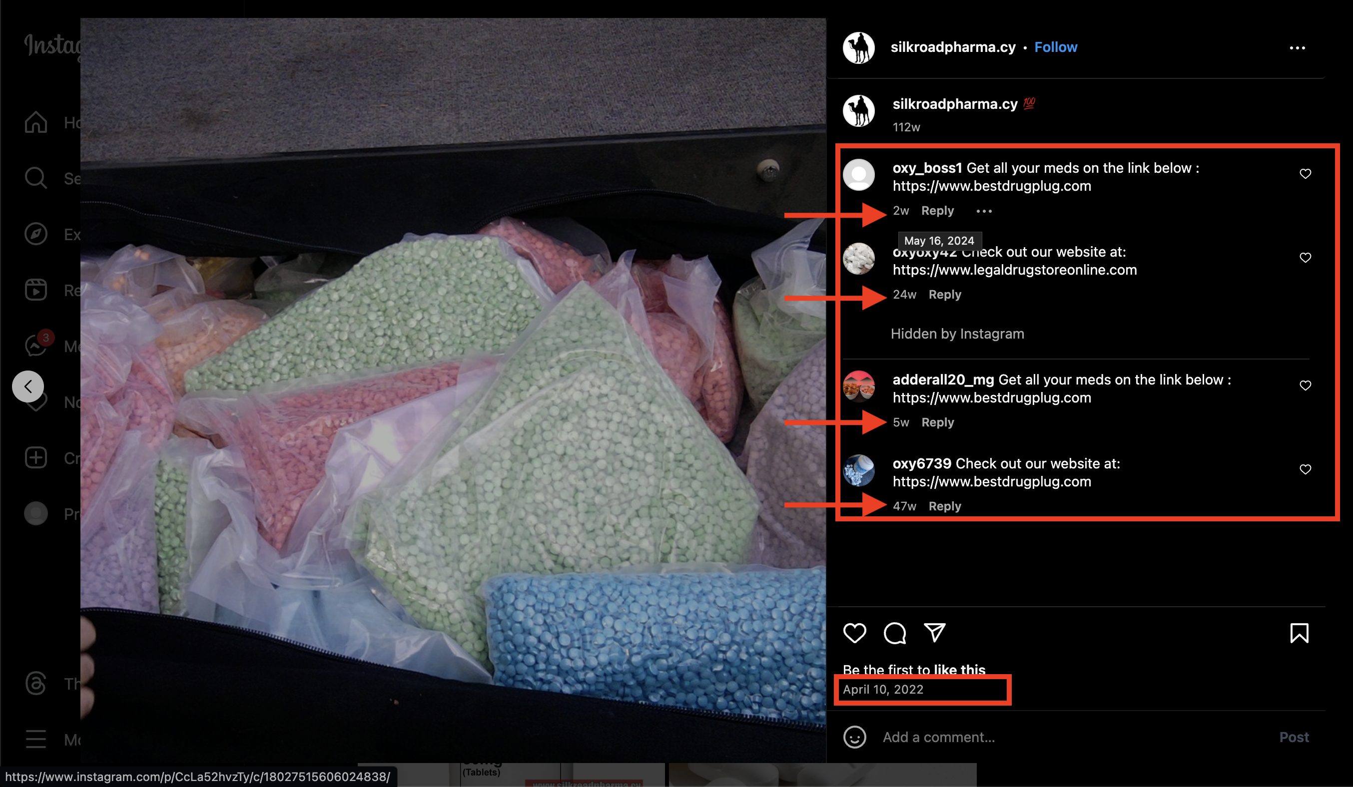 As of June 2024, TTP found that seven of the 50 accounts behind those drug dealing posts remain present on Instagram. One of the remaining accounts, with the handle @silkroadpharma.cy, has been inactive since 2022, but its old posts continue to draw other drug dealers looking for buyers. (The account’s name refers to the notorious dark web marketplace known as the Silk Road.)