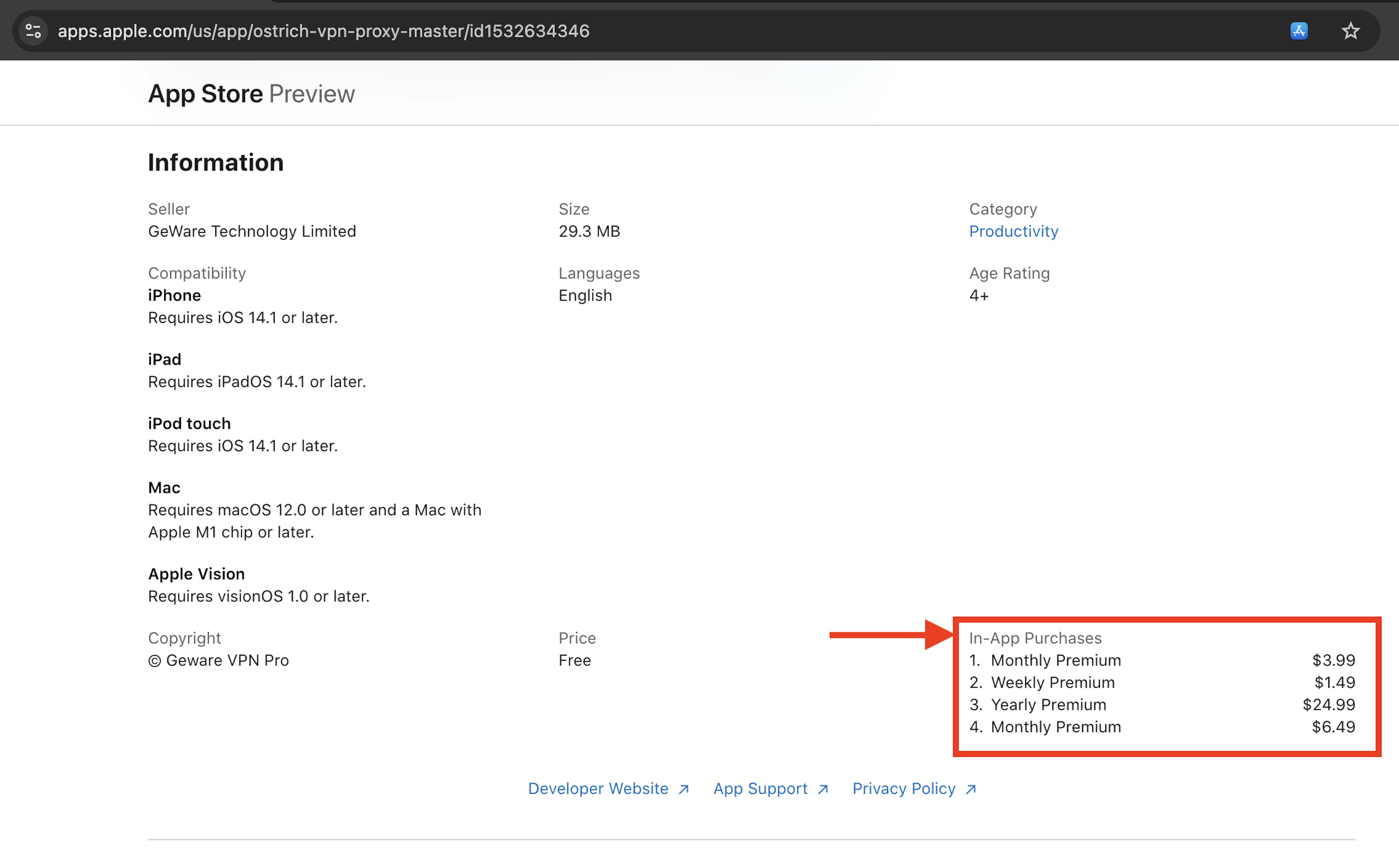In the Apple App Store, the apps specified that users could purchase subscription plans. That means Apple and Google may be profiting from these Chinese owned-VPNs when Americans pay for subscriptions or other add-ons. Both companies take a cut of in-app purchases: Apple charges a 30% fee (15% for those enrolled in its small business program), and Google charges 15% up to $1 million in sales each year and 30% above that. For auto-renewing subscriptions, Apple charges 15% after the first year, and Google charges 15%.